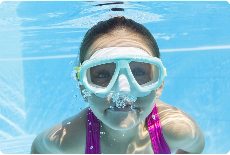 Den turkise svømme- og snorkelmaske fra Bestway er designet til klart udsyn og komfort ved hvert eneste tag. Polykarbonatlinser med UV-beskyttelse skåner øjnene, mens den bløde ansigtskant former sig efter ansigtet og minimerer indtrængning af vand. Med den justerbare silikonerem sidder masken fast og behageligt – også ved længere tids svømning.
