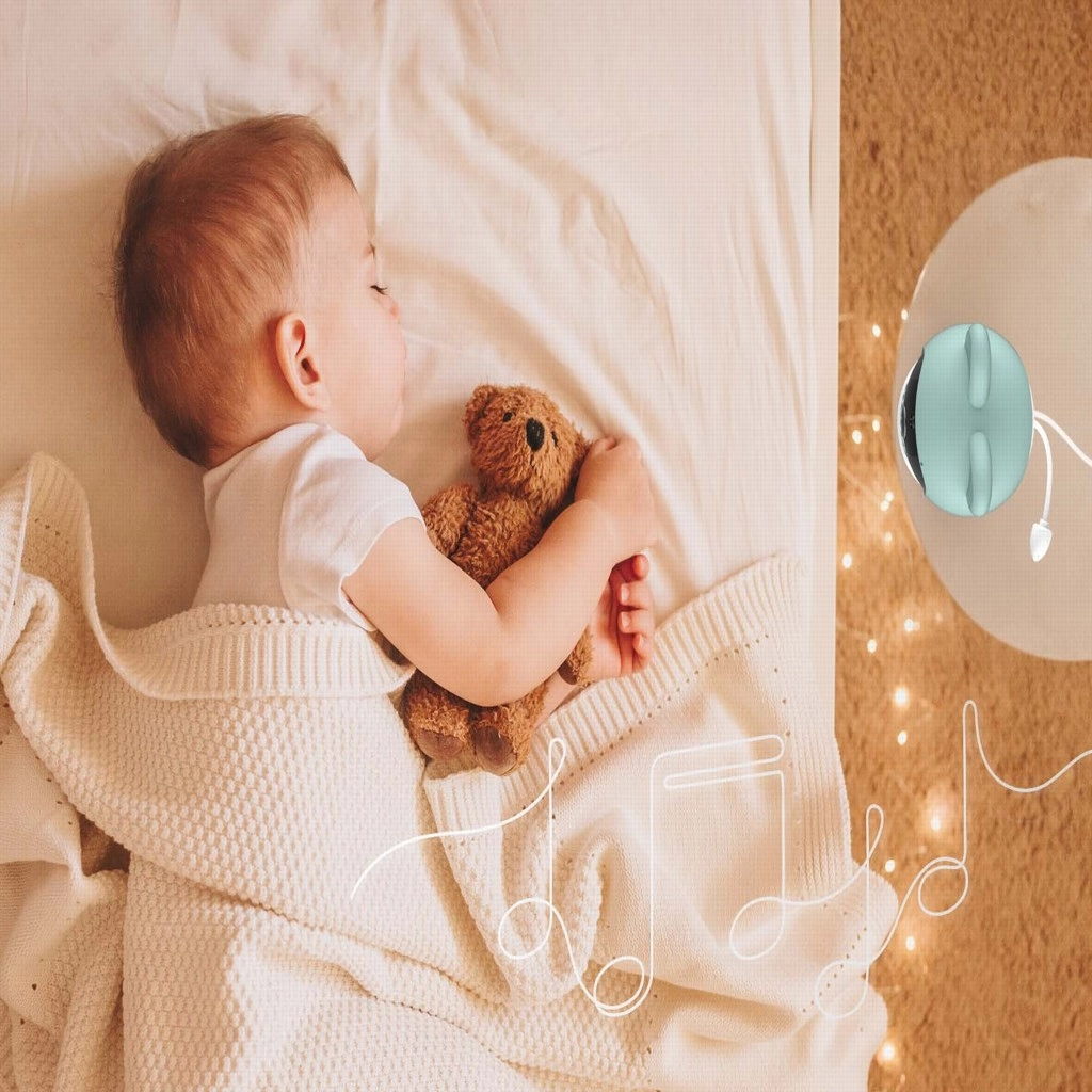 Nemt at installere med fleksibel holder, som gør montering på væg, loft eller tremmeseng mulig. Det minimalistiske design med et silikonecover i bjørneform er sikkert og venligt i børneværelset.