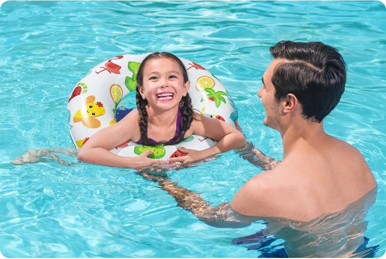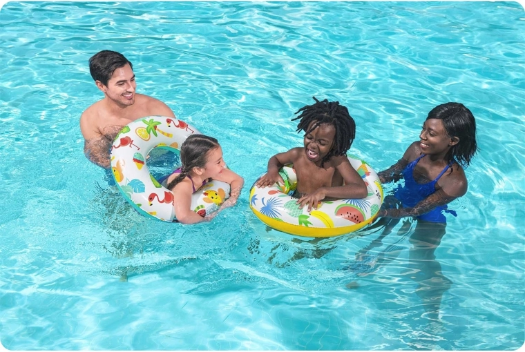 Glade sommermotiver med flamingoer, palmer, frugt og is stimulerer børns fantasi og gør ringen til et attraktivt tilbehør til poolen. Den lette konstruktion gør den nem at bære og puste op.