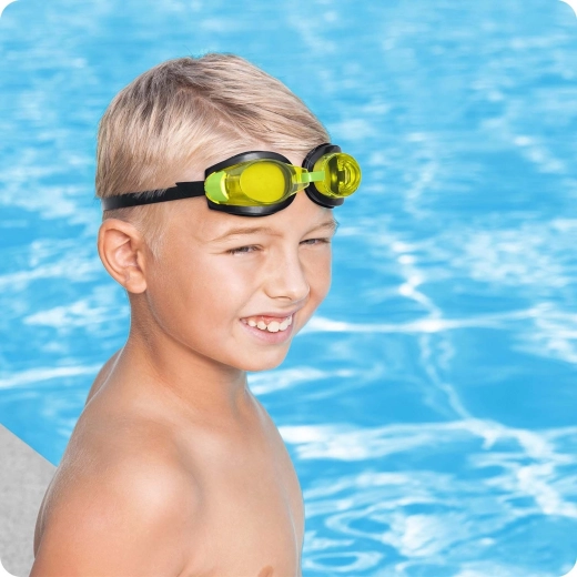 Leder du efter pålidelige børnesvømmebriller til både pool og udendørs badning? Disse BESTWAY-briller med gult tonede linser beskytter øjnene mod vand og sol, mens den bløde tætningskant og den justerbare silikonerem giver en sikker og behagelig pasform. De er ideelle til børn fra 7 år til træning, leg og de første svømmetag.