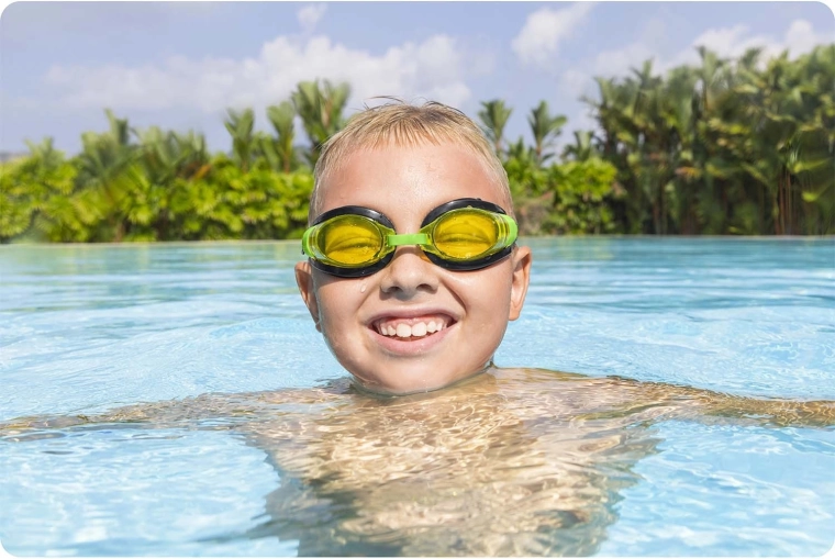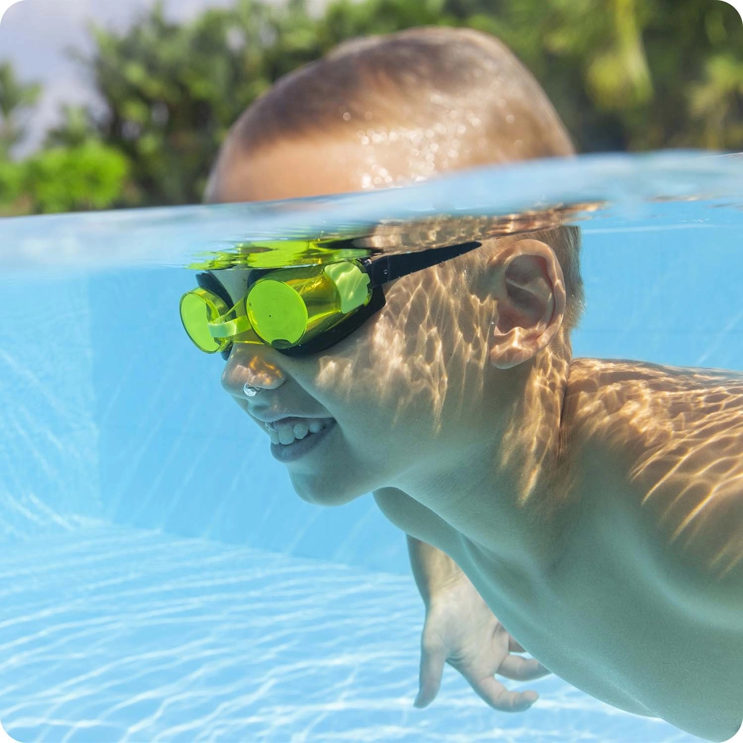 Takket være de UV-modstandsdygtige linser egner de sig også til udendørs pools. Hypoallergene materialer uden latex minimerer risikoen for irritation, mens den robuste konstruktion og det klare synsfelt hjælper børn med at se bedre under vand og fokusere på svømningen.