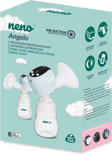 Den trådløse brystpumpe Neno Angelo tilbyder 3 effektive faser af udpumpning (stimulerende, dyb og blandet Let-down) med 9 intensitetsniveauer i hver fase. Den er støjsvag, let og bærbar, har touchskærm, LED-belysning til brug om natten og beskyttelse mod tilbagestrømning. Den blide silikoneindsats er skånsom mod huden, og enheden er fri for BPA.