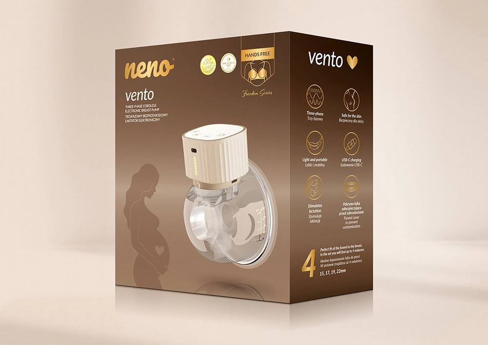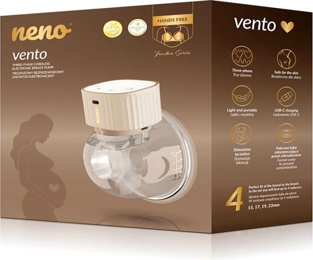 Neno Vento er en moderne elektrisk, bærbar brystpumpe designet til bevægelsesfrihed og komfort. Den sidder direkte i bh’en, fungerer helt uden kabler og muliggør diskret pumpning både dag og nat takket være den stille drift. Den trefasede sugeteknologi – stimulering, dyb udmalkning og kombineret tilstand – efterligner naturlig amning og hjælper effektivt med at starte og opretholde laktationen.