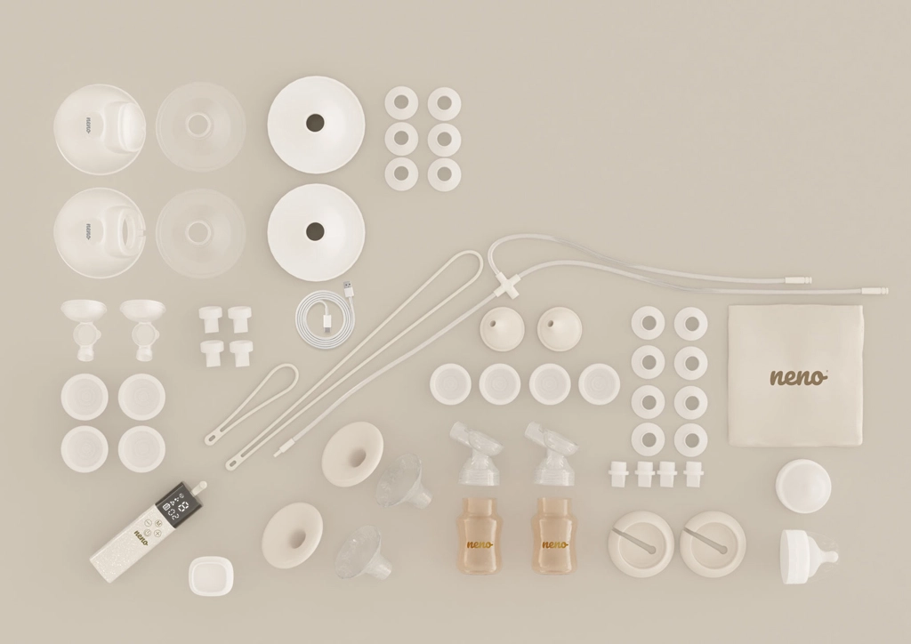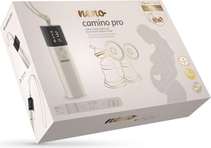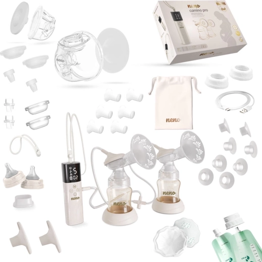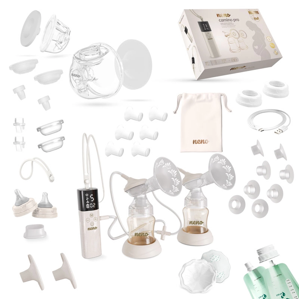 - Neno Camino Pro pumpe, stander, USB-C kabel, velourpose, 2× mælkepose, 2× ammeindlæg, 2× stropper (lang og kort); sæt til pumpning i flaske (2× flaske 150 ml, 2× skjolddæksel, 2× skål 24 mm, 2× holder, silikoneslange, 4× membran, 4× ventil, 2× connector, 2× sæt indsatser 15/17/19/22 mm, 2× flaskehætte med connector); sæt til hands-free opsamling (2× beholder 240 ml, 2× connectorer, 2× membrandæksler, 4× membraner, 2× skåle 24 mm, 4× ventiler, 2× skåldæksler, 2× sæt indsatser 17/19/21 mm)
