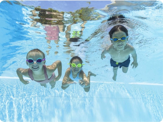 De bløde silikonekanter tilpasser sig barnets ansigtsform og mindsker risikoen for lækage, mens den dobbelte, justerbare rem holder brillerne stabile selv ved hop i vandet.