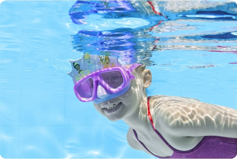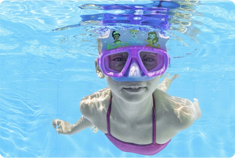 Bestway børne-dykkermaske med PRINCESS-motiv tilbyder et bredt synsfelt, behagelig pasform uden lækage og en justerbar silikonerem for sikker fastgørelse. Polycarbonatlinser med UV-beskyttelse sikrer klart udsyn under vand og beskyttelse af øjnene. Ideel til børn fra 3 år til leg i poolen og de første snorkleoplevelser.