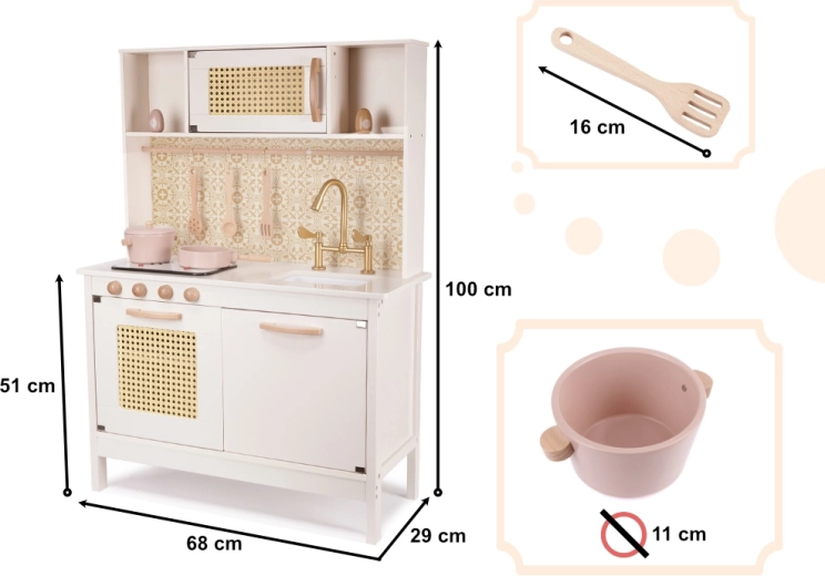Et stilfuldt trælegekøkken i retro BOHO-design giver børn timevis af kreativ leg. Det byder på lysende og lydgivende kogeplader, dyb vask med gylden hane, rattanfyld i lågerne og masser af trætilbehør. Sikkert, præcist udført og perfekt til indretninger i Scandi- og Boho-stil.