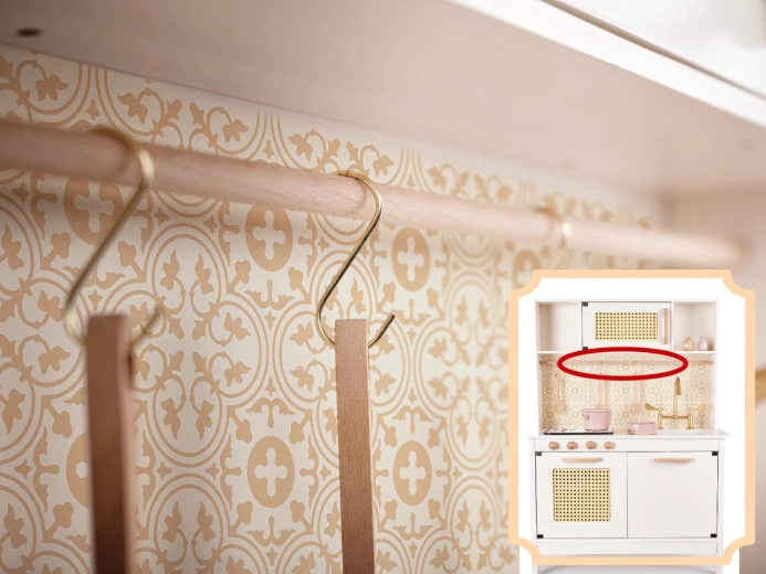 Styrk børnenes fantasi og finmotorik med et køkken, der ligner det ægte. Drejelige træknapper, åbnebare låger, en skinne med kroge og et aftageligt kogepladepanel med lys- og lydeffekter gør madlavningen sjov og lærerig uden risiko. Et vendbart bagpanel (glat cremefarvet/ornamental tapet) gør det nemt at ændre køkkenets udseende efter humør.