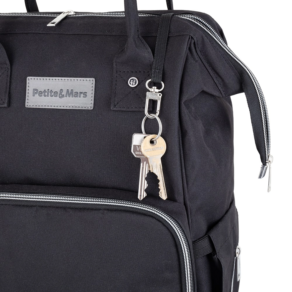 Nyd de gennemtænkte detaljer: to termolommer holder flasker ved den rette temperatur, en vandtæt lomme adskiller sikkert våde ting, en nøglesnor gør søgningen hurtigere, og en baglynlås giver lynhurtig adgang til hovedrummet. Rygsækken fastgøres nemt til barnevognen eller kuffertens håndtag, og med det lyse foer finder du altid hurtigt det, du har brug for.