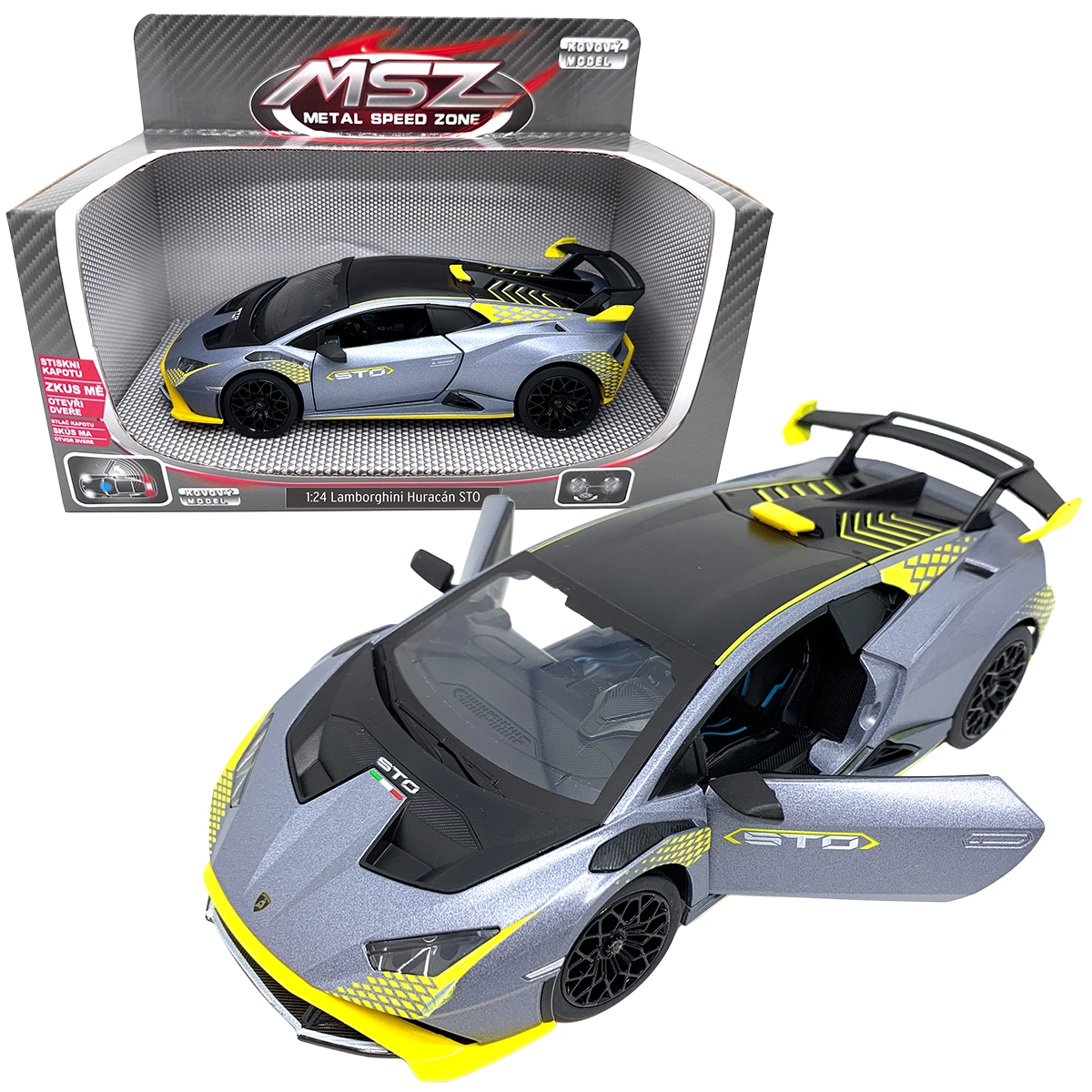 Oplev den realistiske metalmodel af LAMBORGHINI Huracán STO i skala 1:24, som vil begejstre både børn og samlere. Den byder på åbne døre, lys- og lydeffekter samt præcis udførelse i metal med plastdetaljer for lang holdbarhed og en fantastisk legeoplevelse.