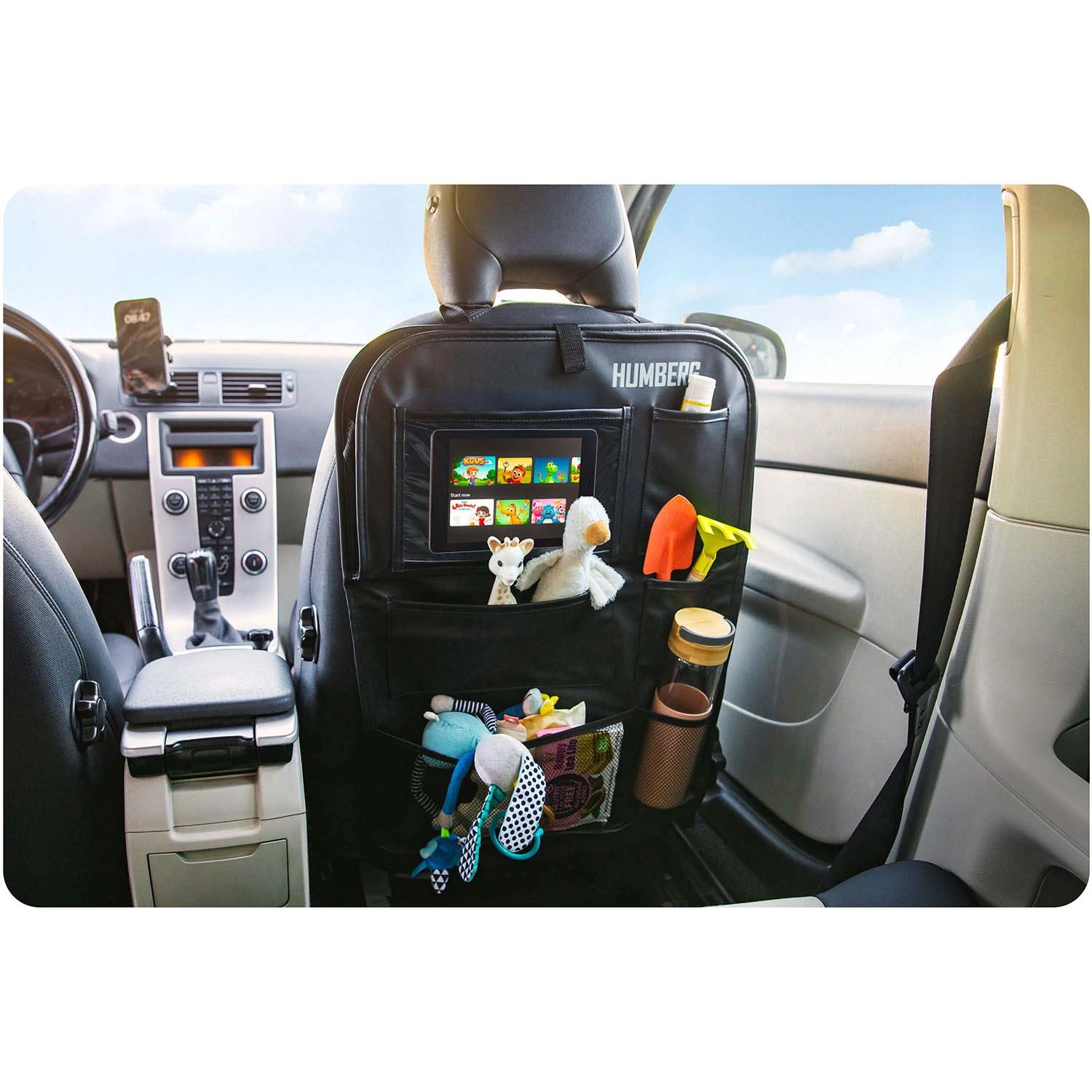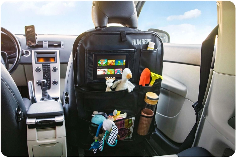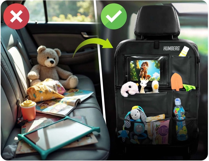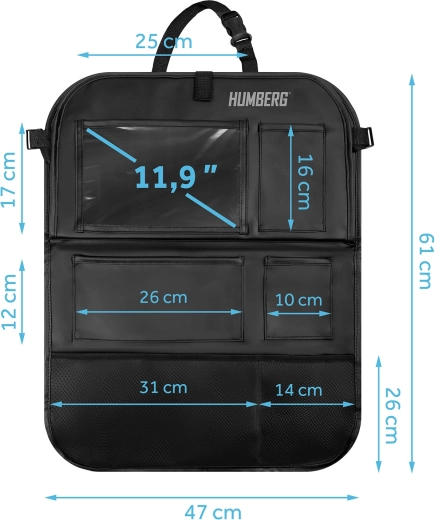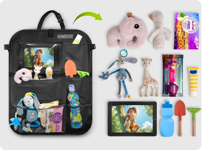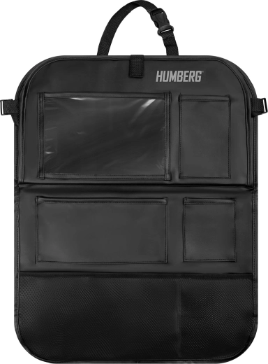 Hold bilen organiseret og kørsel med børn mere rolig takket være den praktiske HUMBERG organizer til bagsiden af sædet. Den tilbyder en gennemsigtig tabletlomme med touch-folie, et nedklappeligt bord til snack eller tegning, en flaskeholder og flere rummelige lommer til legetøj og småting. Let montering, materiale der er nemt at rengøre og beskyttelse af polstringen mod snavs fra sko.