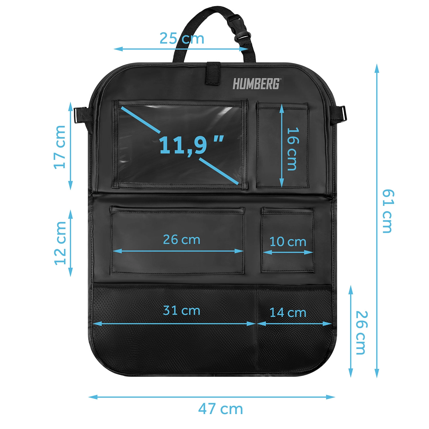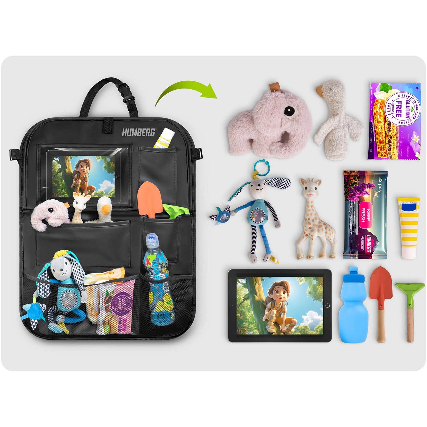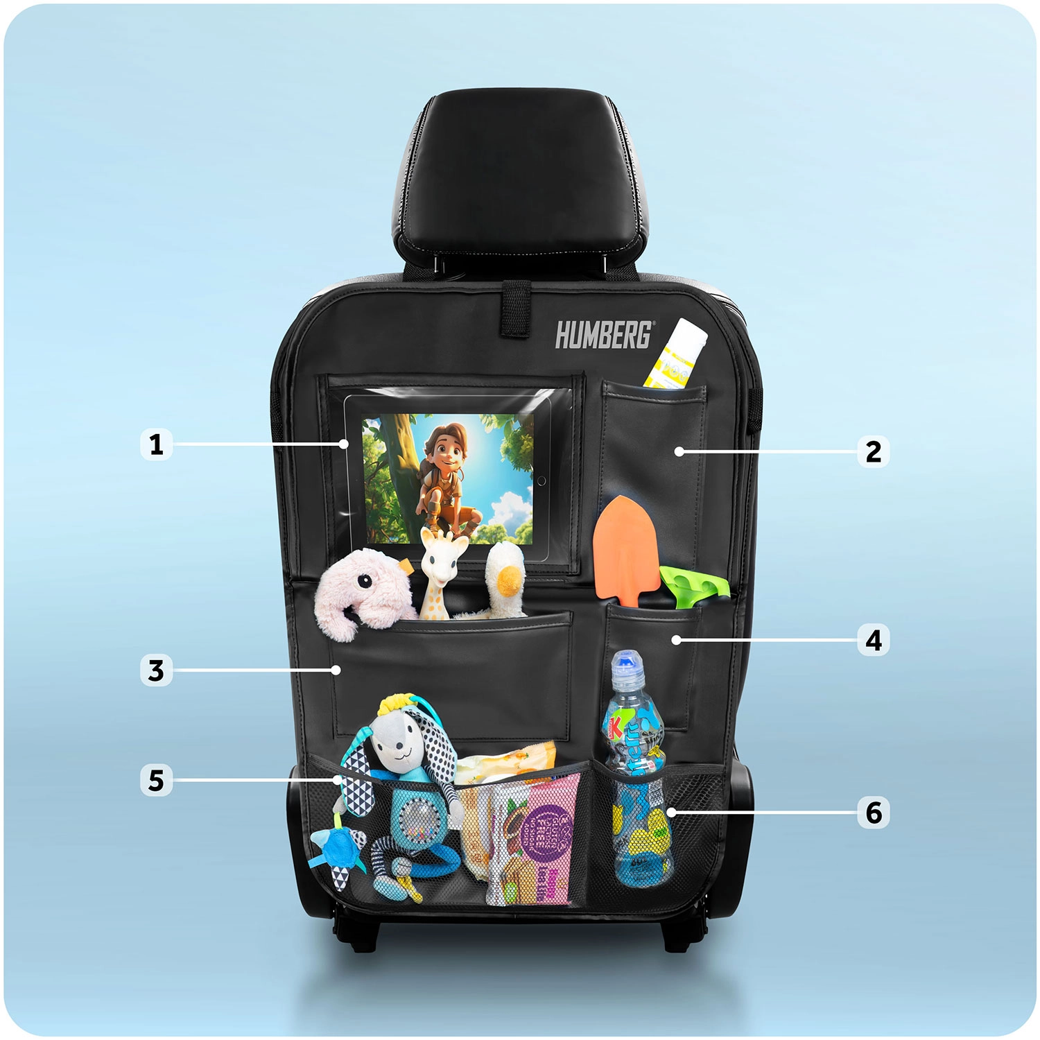 Hold bilen organiseret og kørsel med børn mere rolig takket være den praktiske HUMBERG organizer til bagsiden af sædet. Den tilbyder en gennemsigtig tabletlomme med touch-folie, et nedklappeligt bord til snack eller tegning, en flaskeholder og flere rummelige lommer til legetøj og småting. Let montering, materiale der er nemt at rengøre og beskyttelse af polstringen mod snavs fra sko.