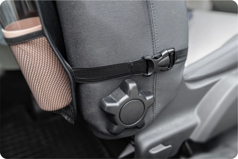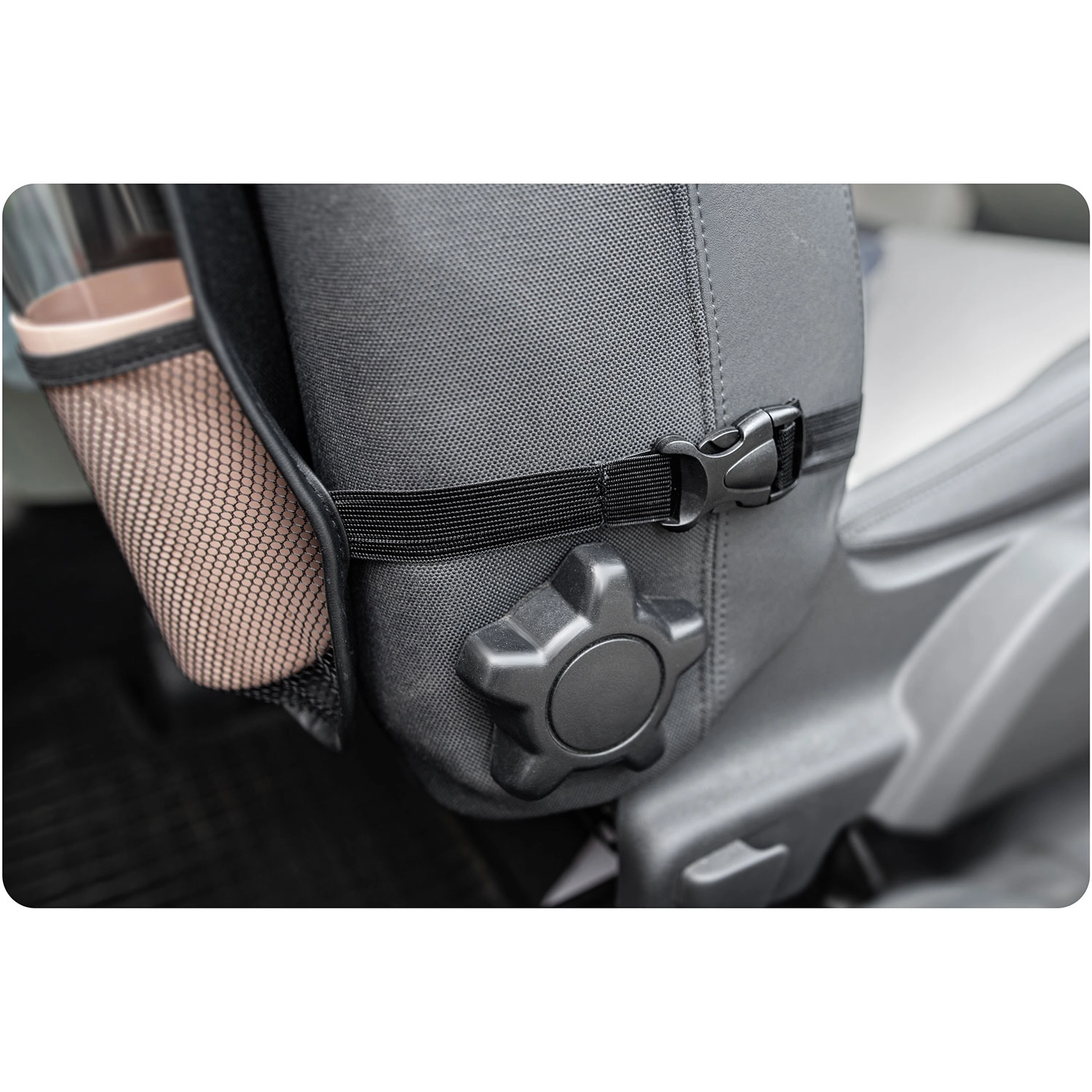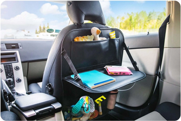 Elastiske netlommer til drikkevarer, øvre og nedre lommer til legetøj, bøger og småting – alt har sin plads og er lige ved hånden.