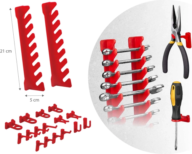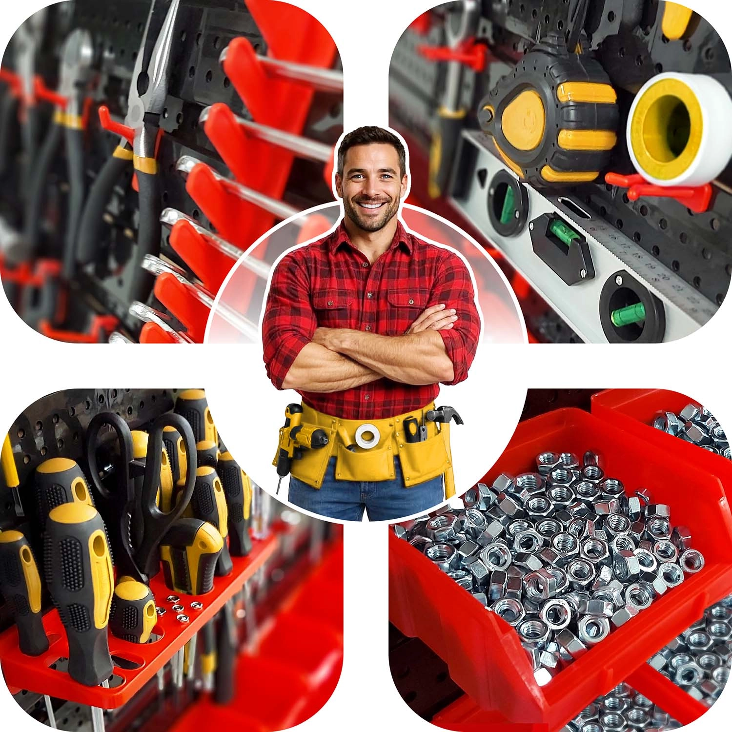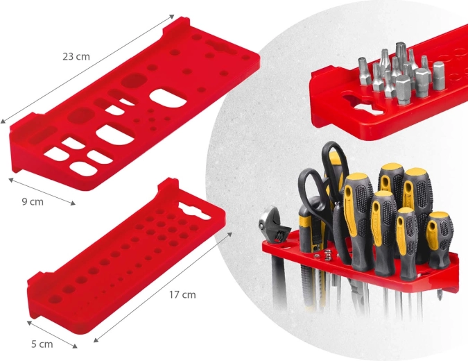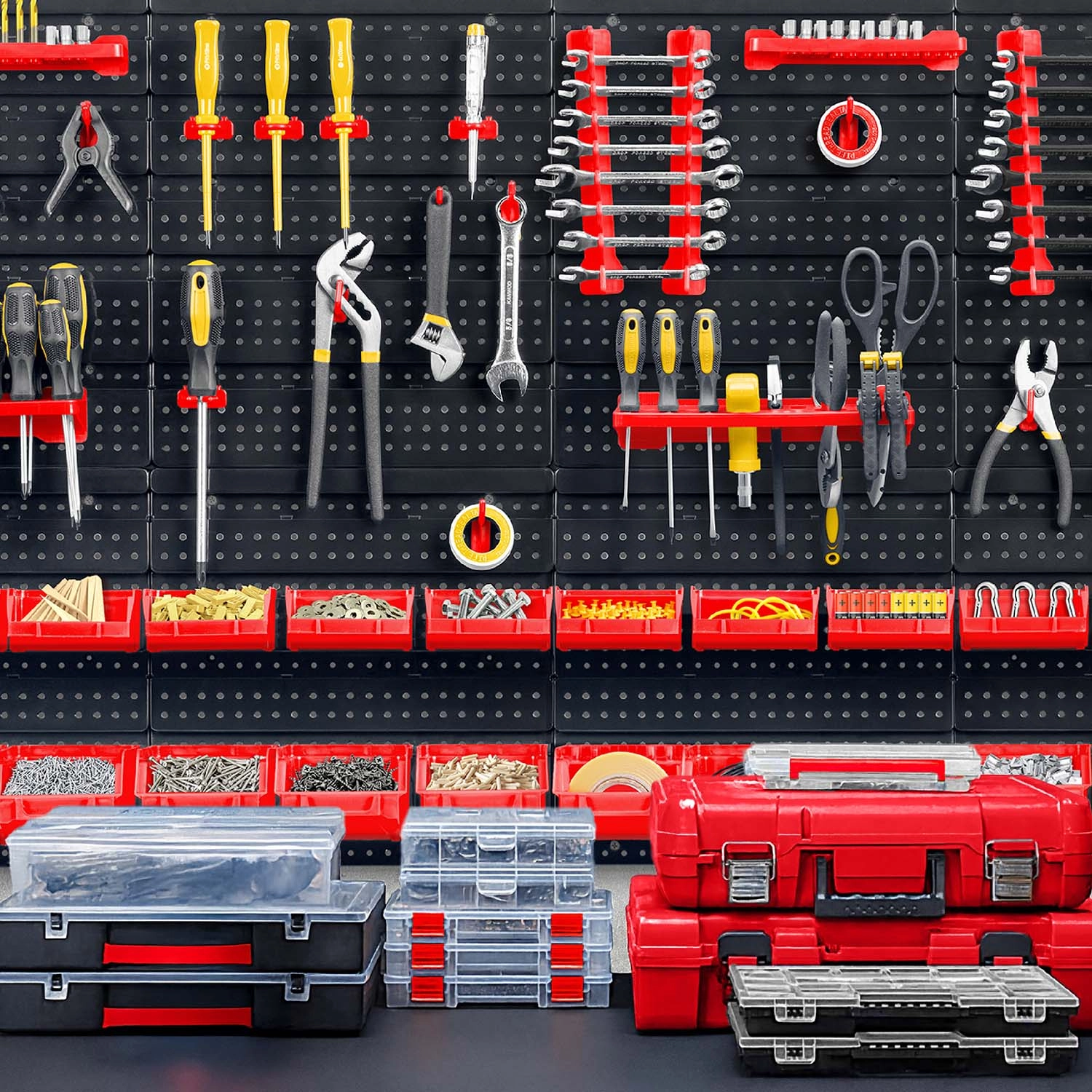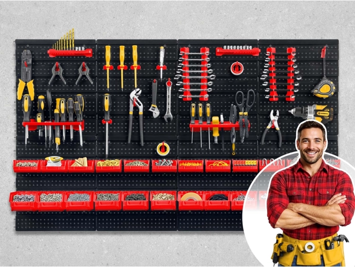 Det modulære HUMBERG pegboard-system forvandler ethvert område til en perfekt organiseret arbejdsplads. Kombinationen af alsidige kroge og holdere, bakker i to størrelser og praktiske hylder sikrer, at skruetrækkere, tænger, bits, bor og befæstelse altid er lige ved hånden. De robuste, perforerede paneler tåler daglig brug, og takket være den smarte sammensætning kan du nemt tilpasse tavlen til dine vaner.