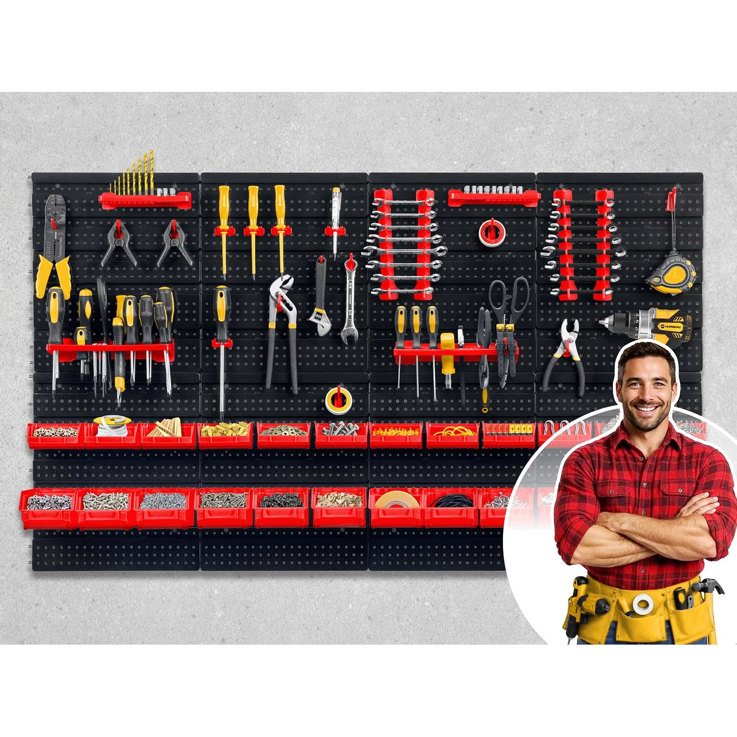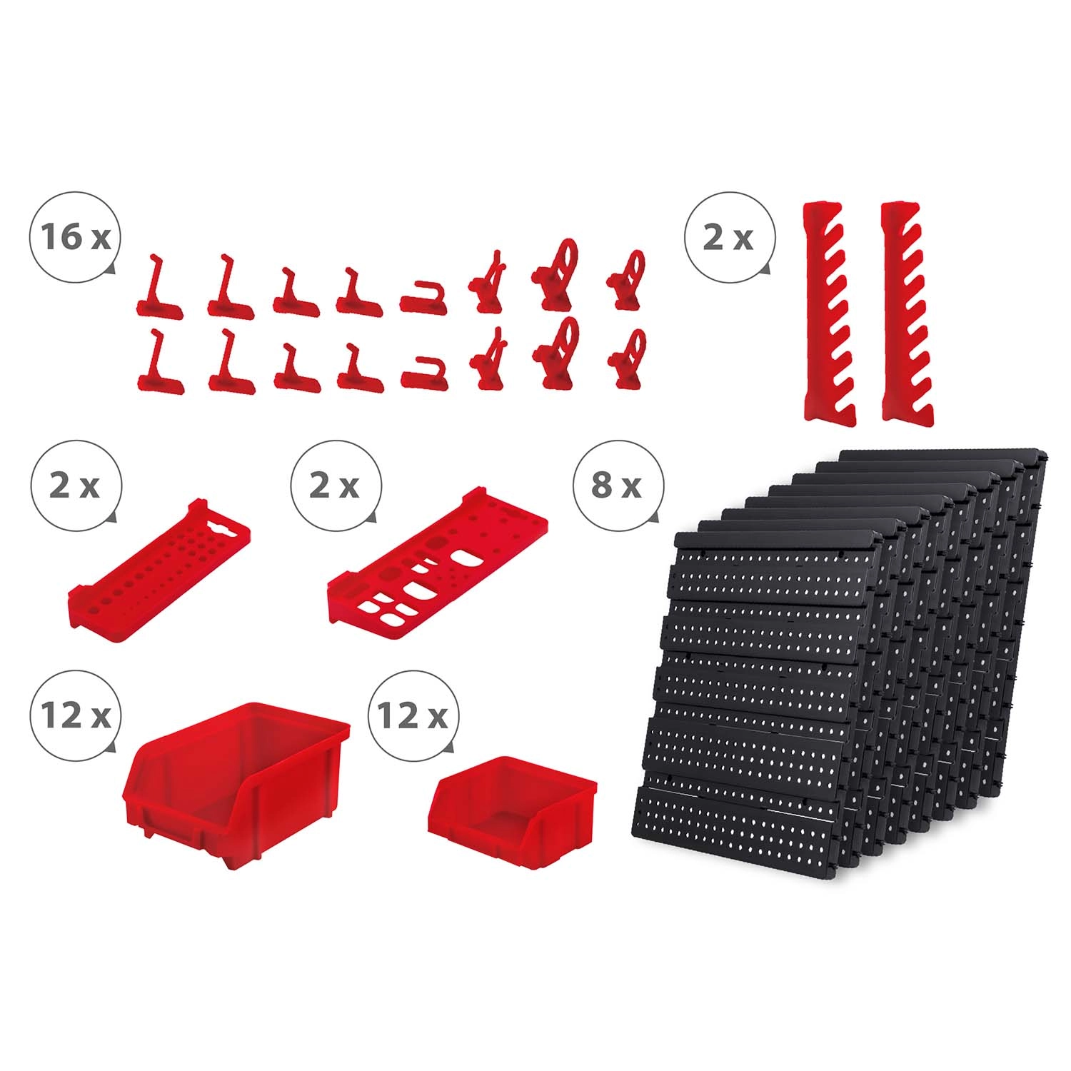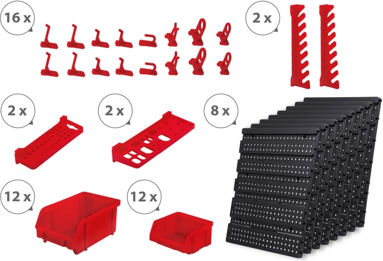 Seks perforerede paneler og 54 tilbehørsdele gør det nemt at opbevare håndværktøj, bits og smådele overskueligt – altid lige ved hånden.