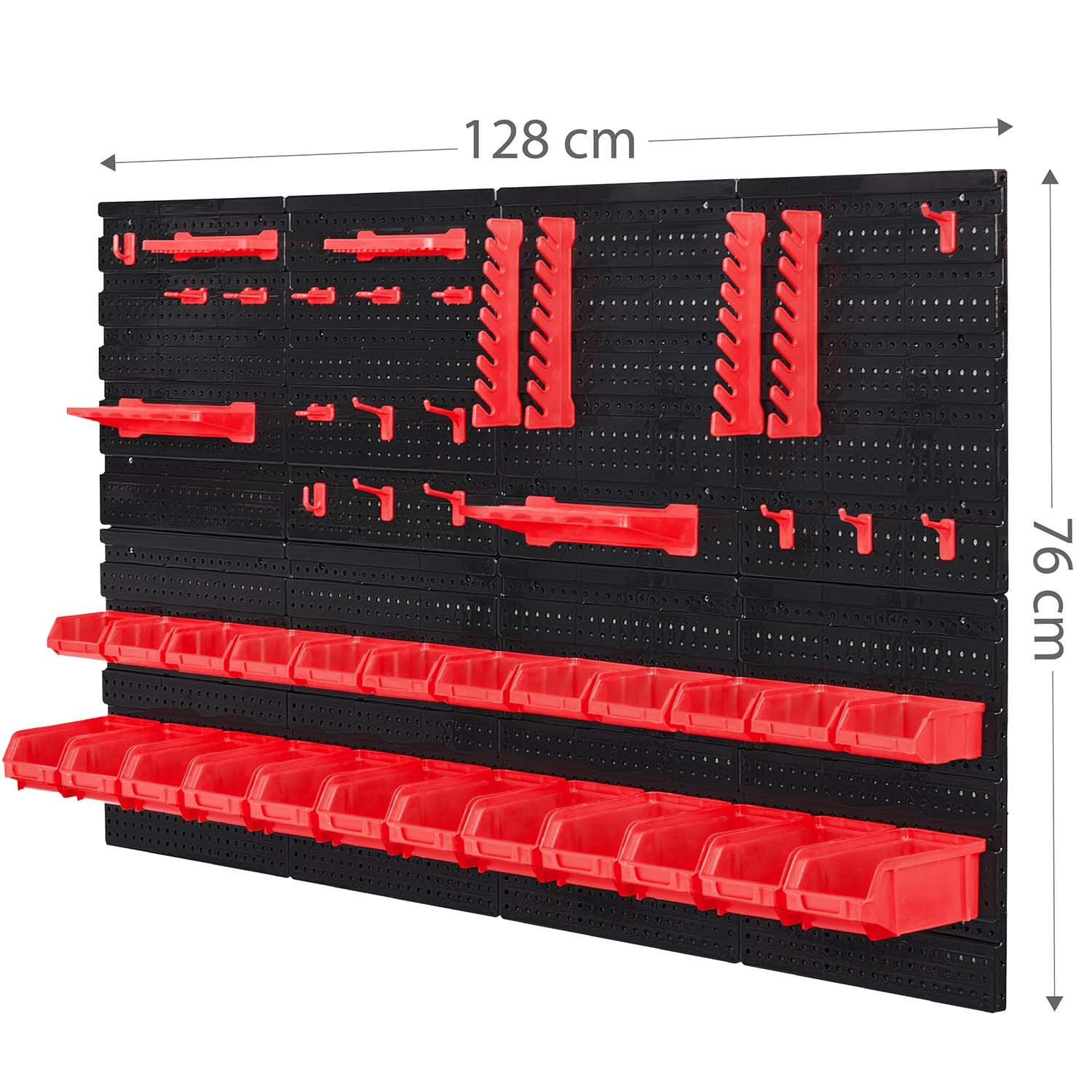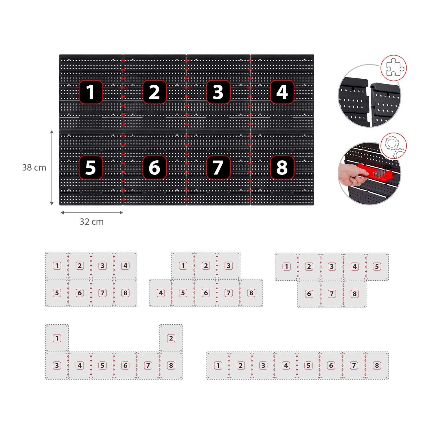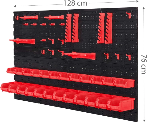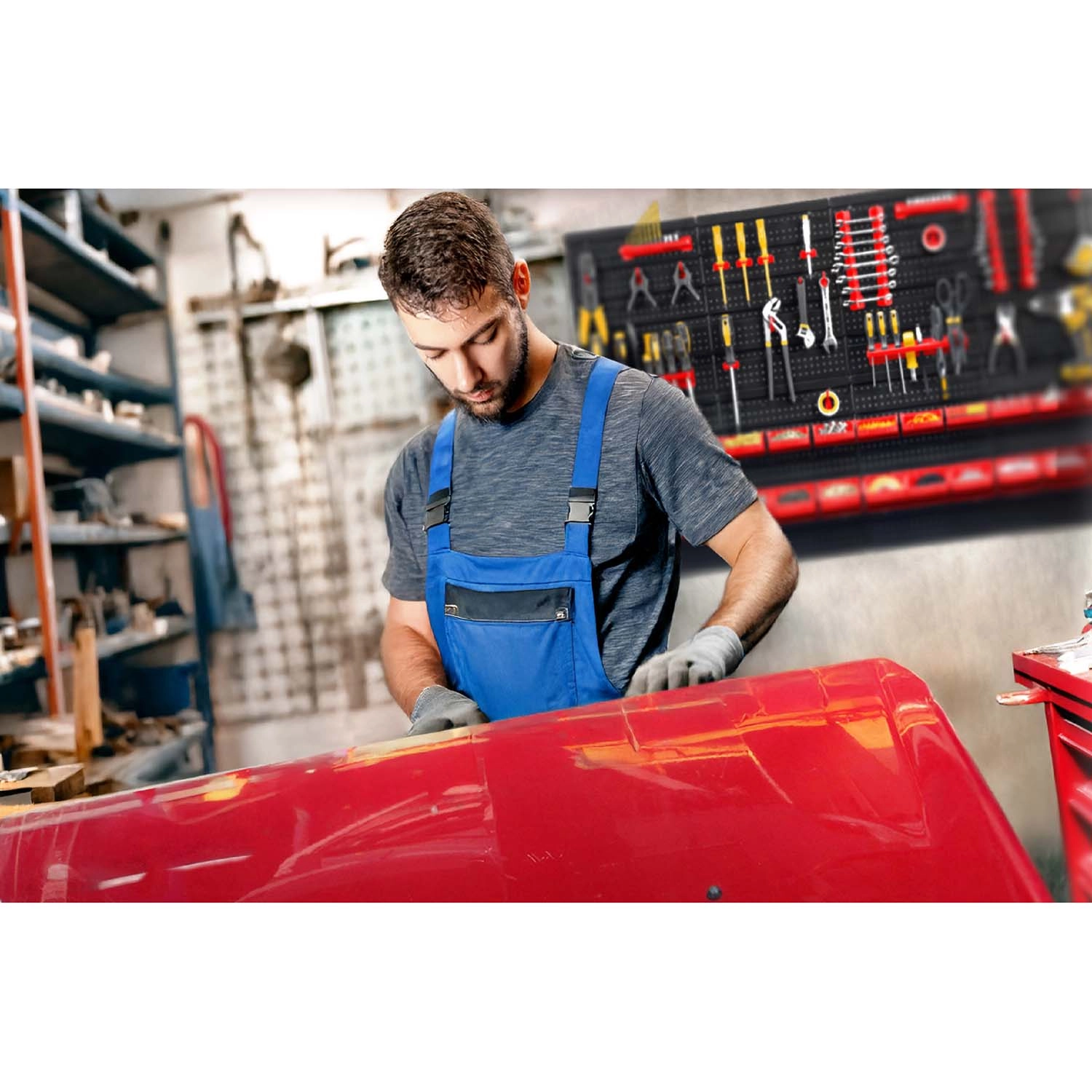 Seks perforerede paneler og 54 tilbehørsdele gør det nemt at opbevare håndværktøj, bits og smådele overskueligt – altid lige ved hånden.