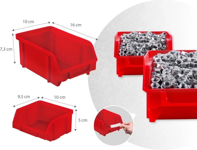 12 små og 12 store bakker til skruer og bolte, 16 kroge og holdere plus 2 nøgleholdere – nem sortering og hurtig adgang.