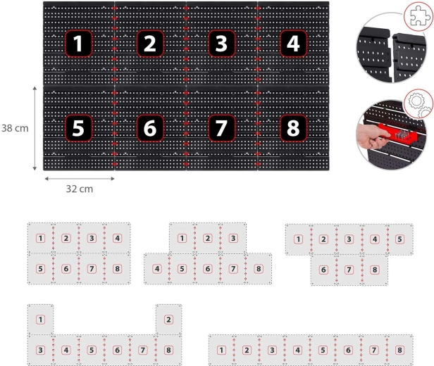Pakkens indhold: 6 modulære paneler, 12 små bakker (9,5 × 10 × 5 cm), 12 store bakker (16 × 10 × 7,3 cm), 2 hylder 23 × 9 cm, 2 hylder 17 × 5 cm, 16 holdere og kroge, 2 nøgleholdere samt montage-rawlplugs til forskellige overflader (beton, mursten, træ, plade). Monteringen er hurtig og intuitiv – elementerne klikkes blot i perforeringen og kan omarrangeres når som helst.