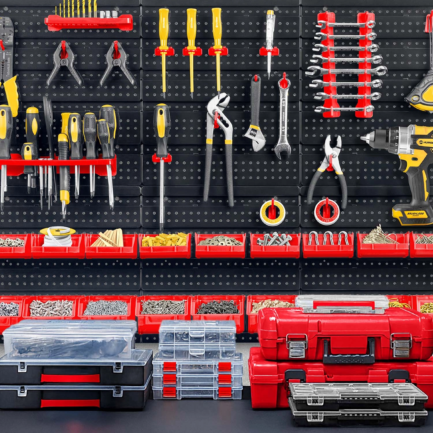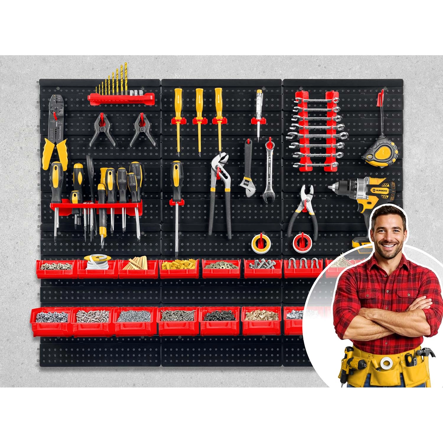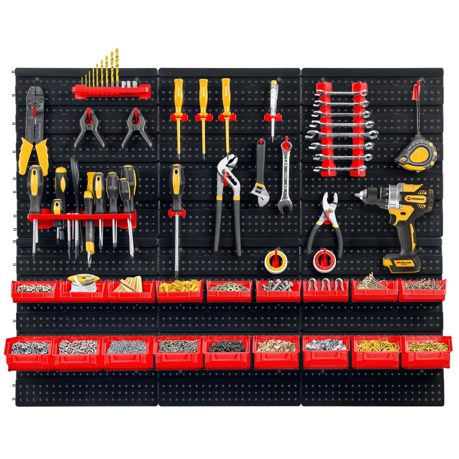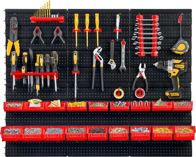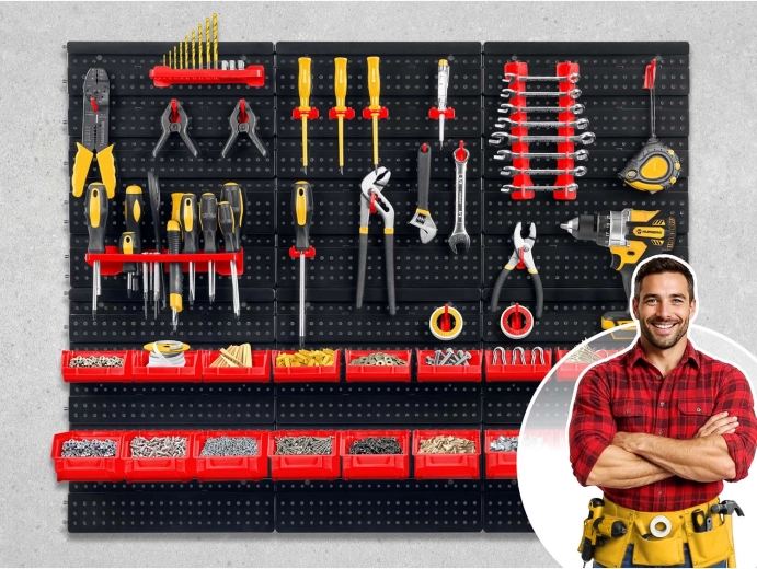 Det komplette vægmonterede organiseringssystem fra HUMBERG er en uundværlig hjælper til ethvert værksted og enhver hjemmegarage. Takket være det modulære system af perforerede paneler kan du nemt sammensætte layoutet præcis efter dine behov. Stærke kroge, holdere og hylder bærer skruetrækkere, tænger og nøgler, mens bakker i forskellige størrelser giver tydelig sortering af befæstelsesmateriale.