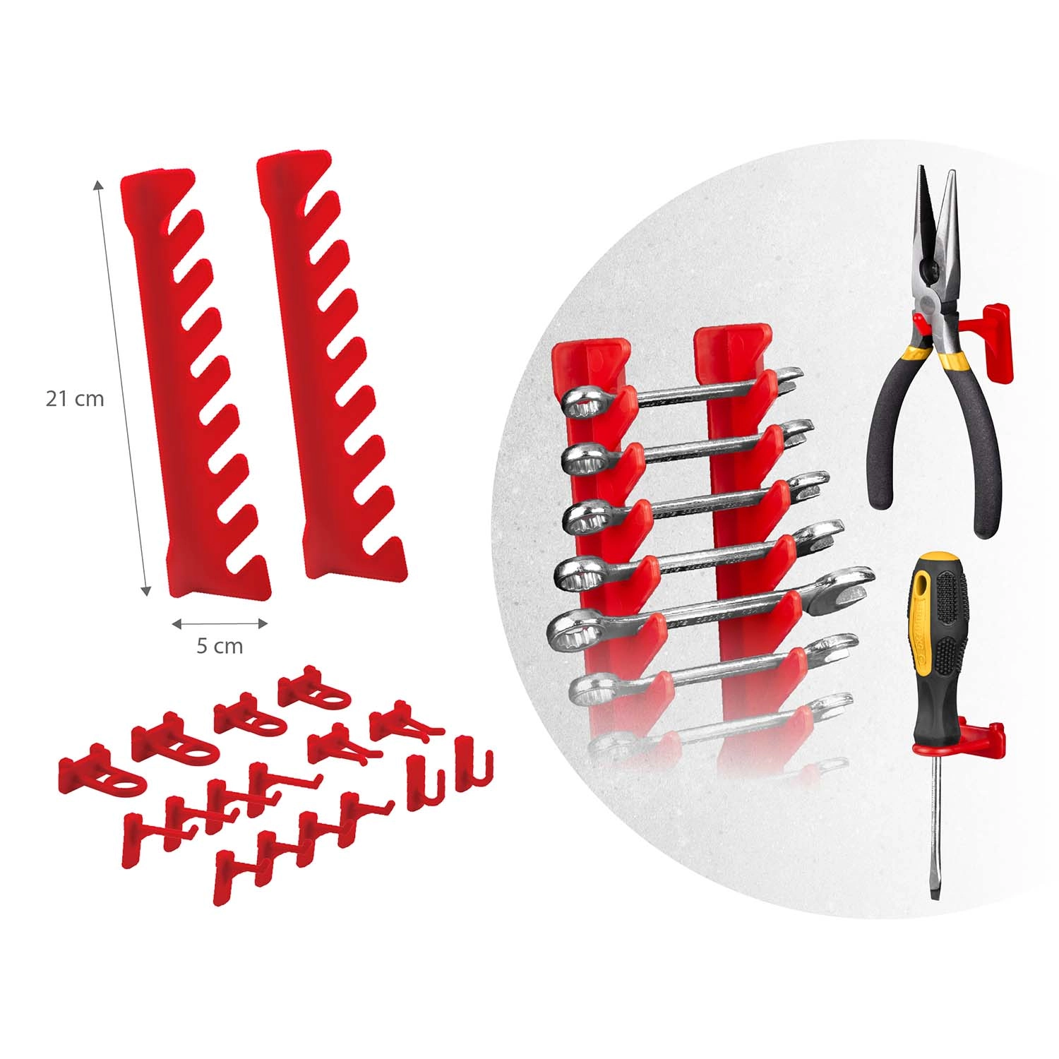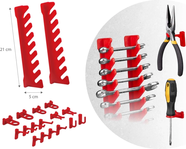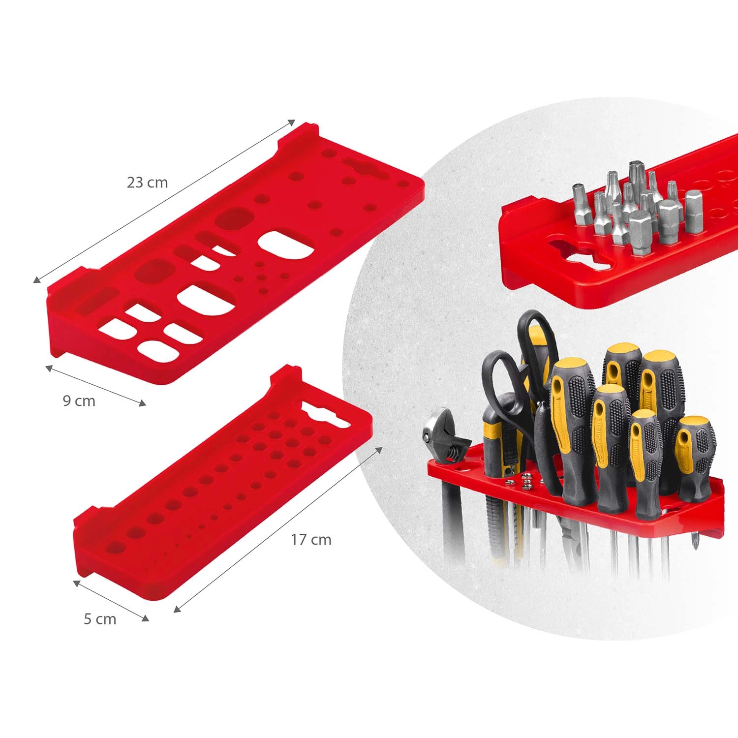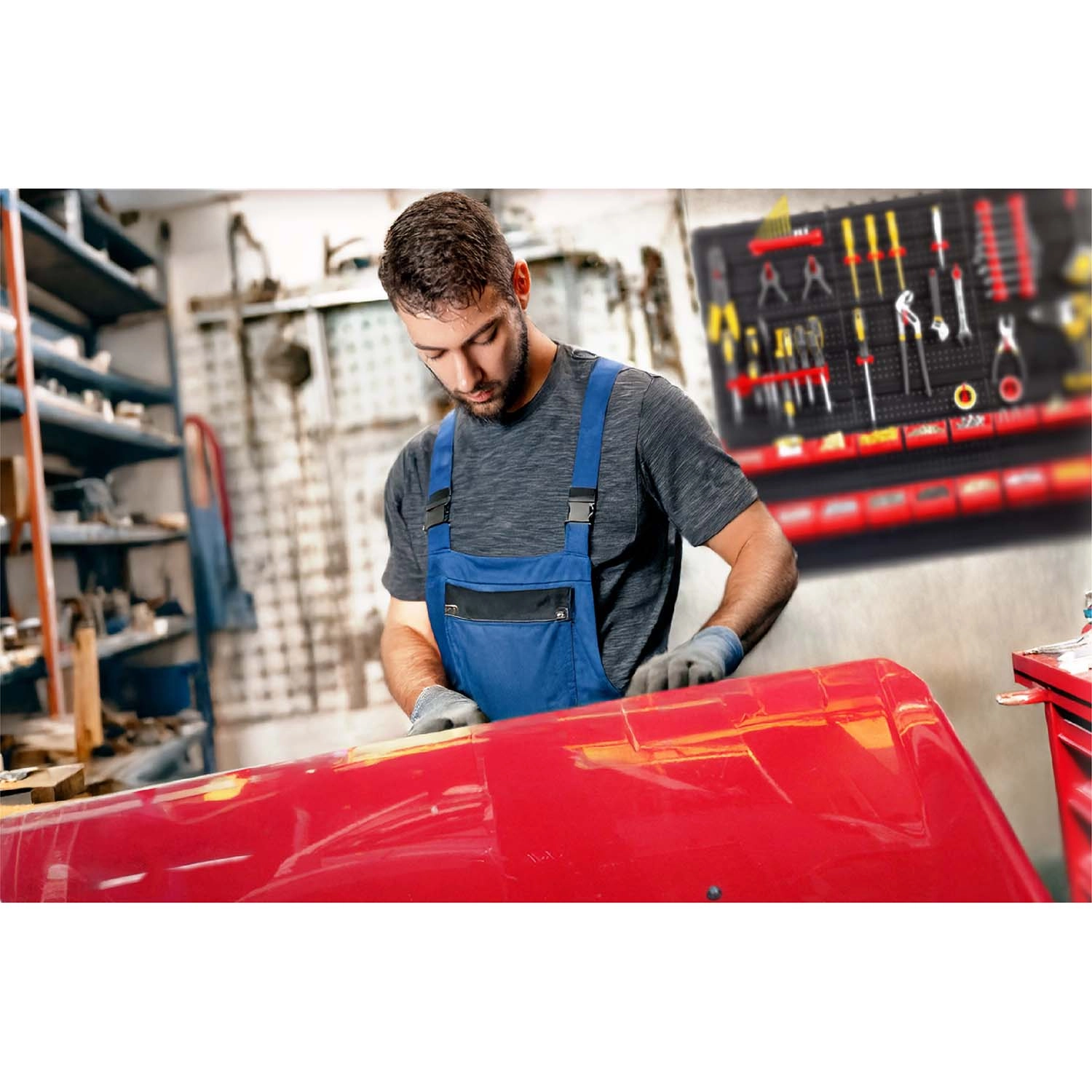 Det komplette vægmonterede organiseringssystem fra HUMBERG er en uundværlig hjælper til ethvert værksted og enhver hjemmegarage. Takket være det modulære system af perforerede paneler kan du nemt sammensætte layoutet præcis efter dine behov. Stærke kroge, holdere og hylder bærer skruetrækkere, tænger og nøgler, mens bakker i forskellige størrelser giver tydelig sortering af befæstelsesmateriale.