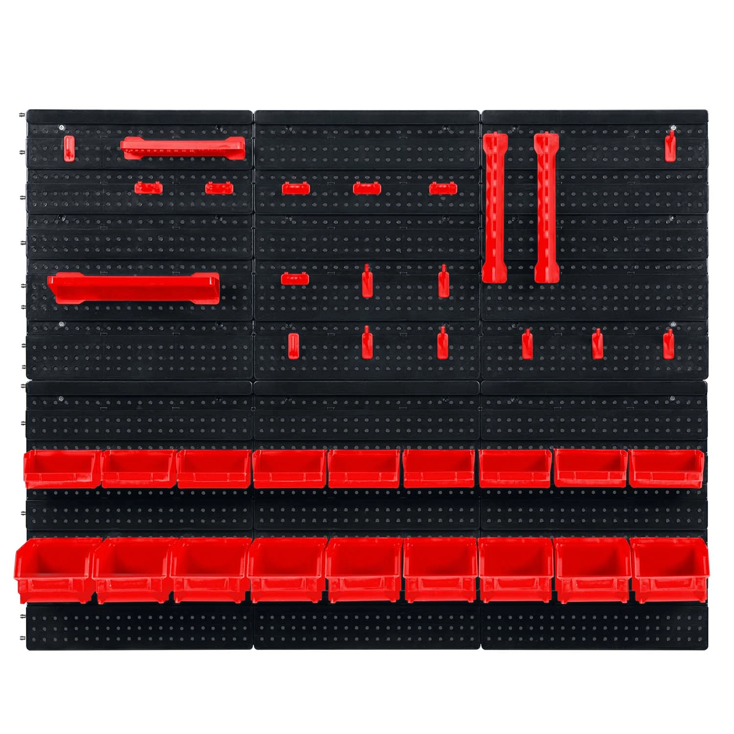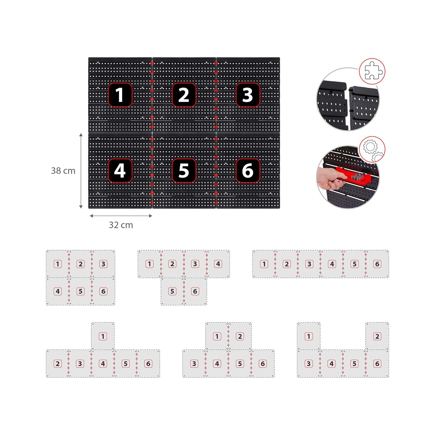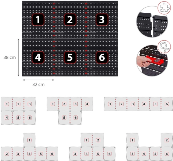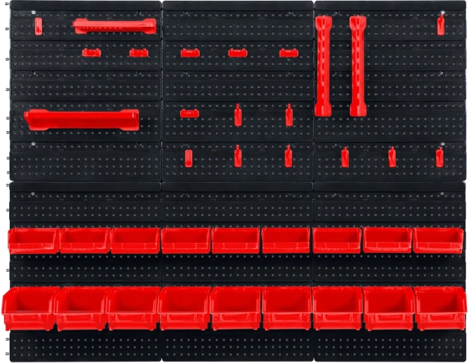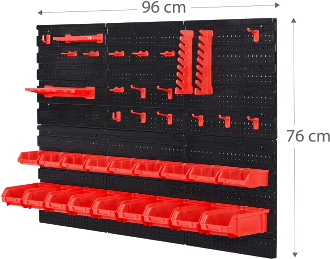 Sættet indeholder et stort udvalg af tilbehør: 6 modulære paneler og i alt 43 elementer – 18 bakker (9 små 9,5 × 10 × 5 cm og 9 store 16 × 10 × 7,3 cm), 2 aflægningshylder (23 × 9 cm og 17 × 5 cm), 16 kroge og holdere samt 1 sæt nøgleholdere. Universaldyvler til montering i beton, mursten, træ og plade medfølger i pakken.