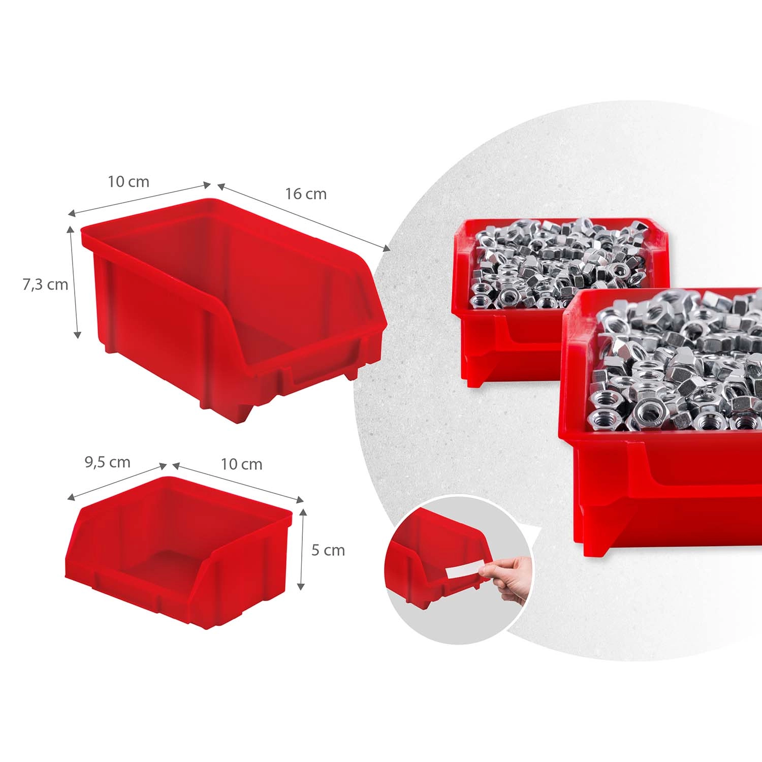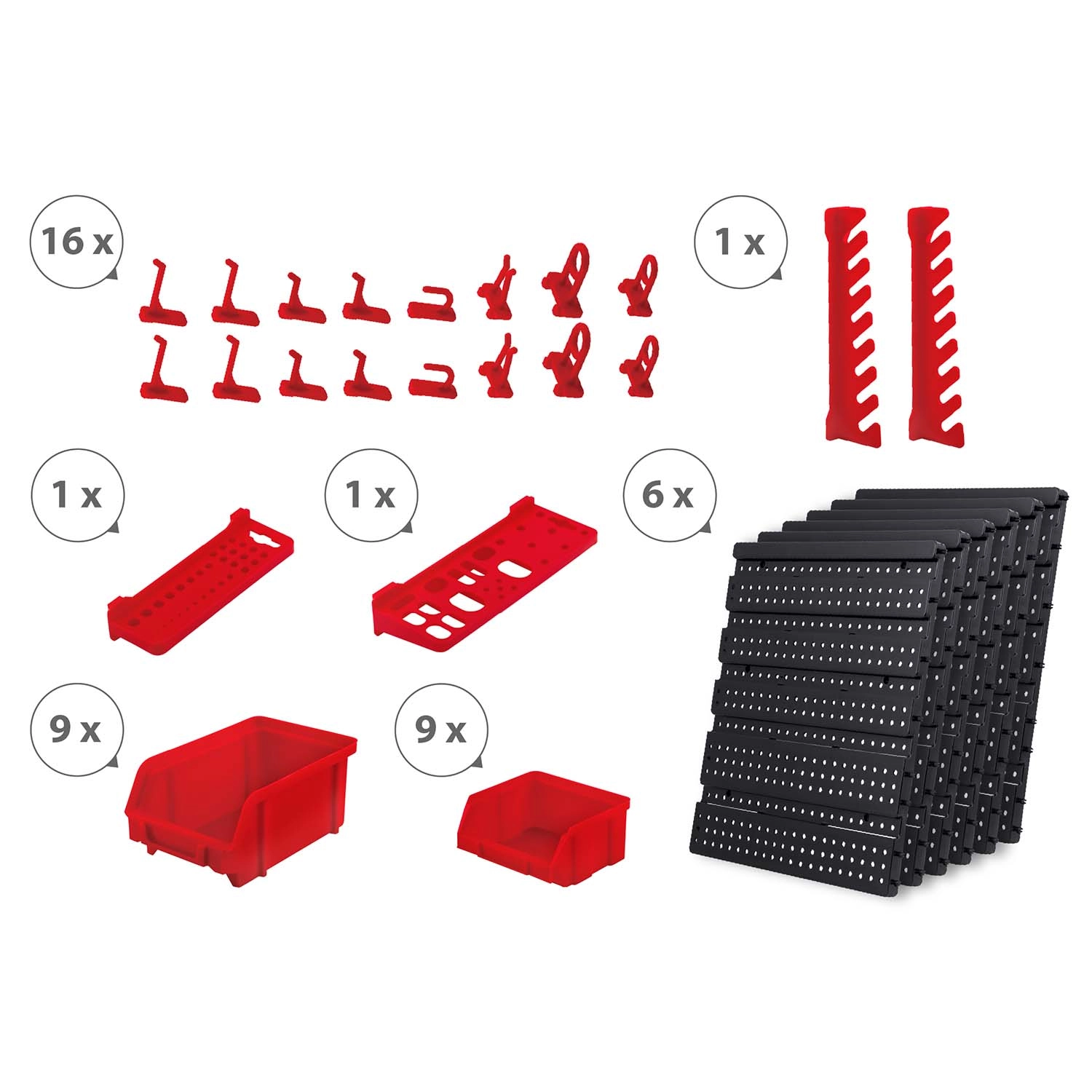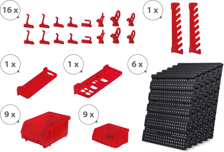 18 bakker i to størrelser, to aflægningshylder samt et sæt kroge og holdere sikrer overskuelig sortering af befæstelsesmateriale og sikker opbevaring af værktøj.