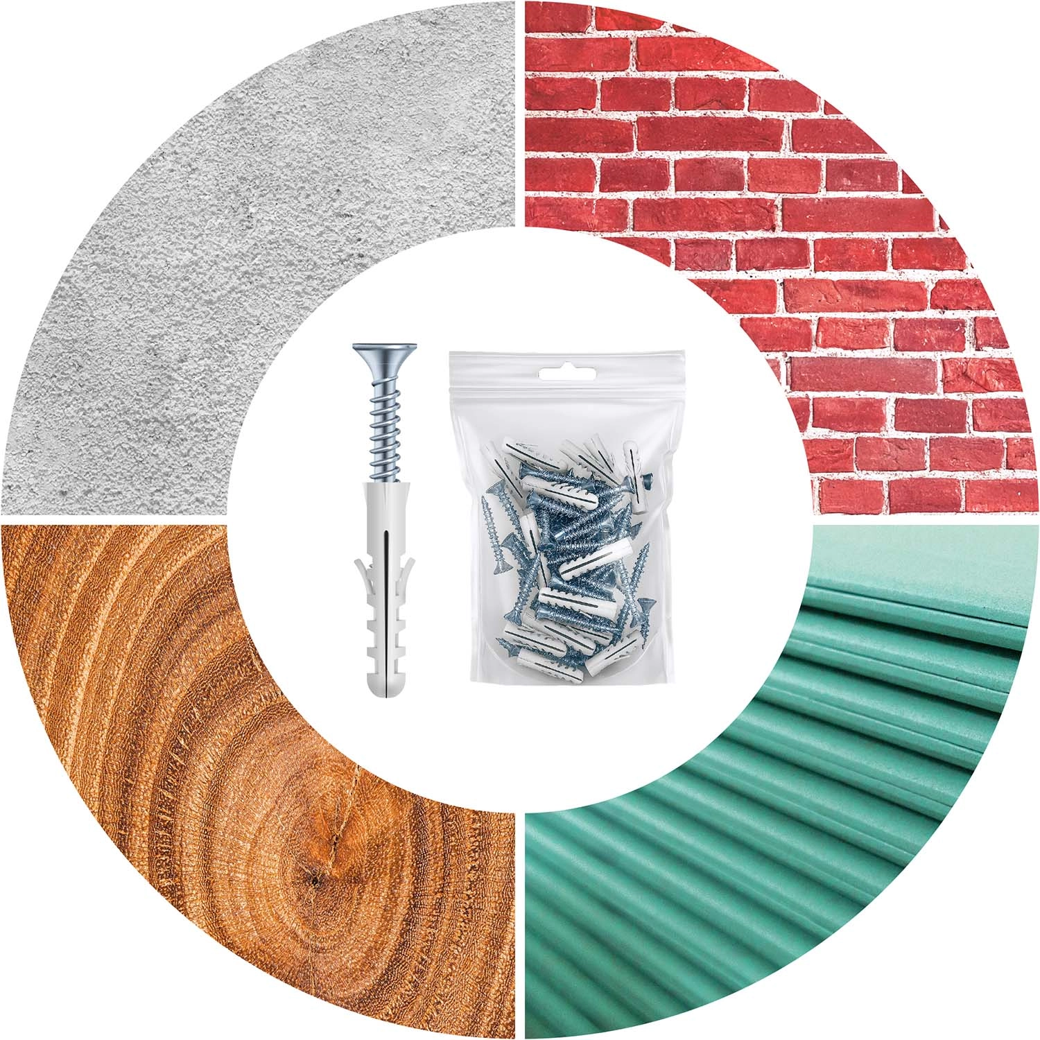 I pakken finder du universaldyvler og skruer til montering i beton, mursten, træ og plade. Hurtig installation og stabil fastgørelse.