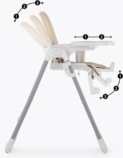 To justeringspositioner bringer bakken tættere på barnet, så alt er inden for rækkevidde og siddestillingen er stabil.