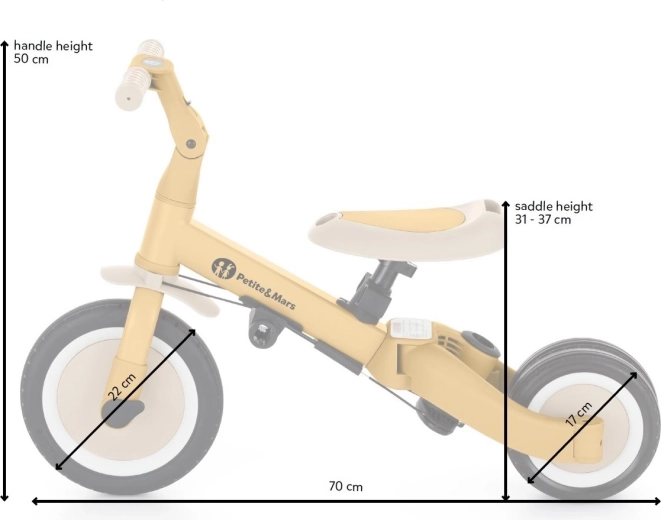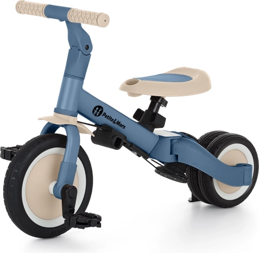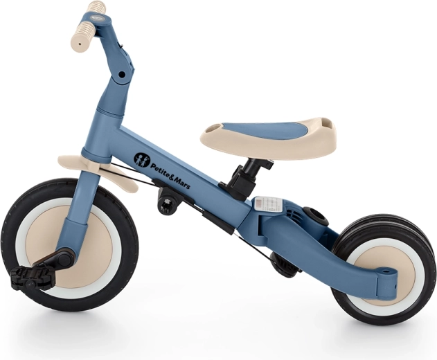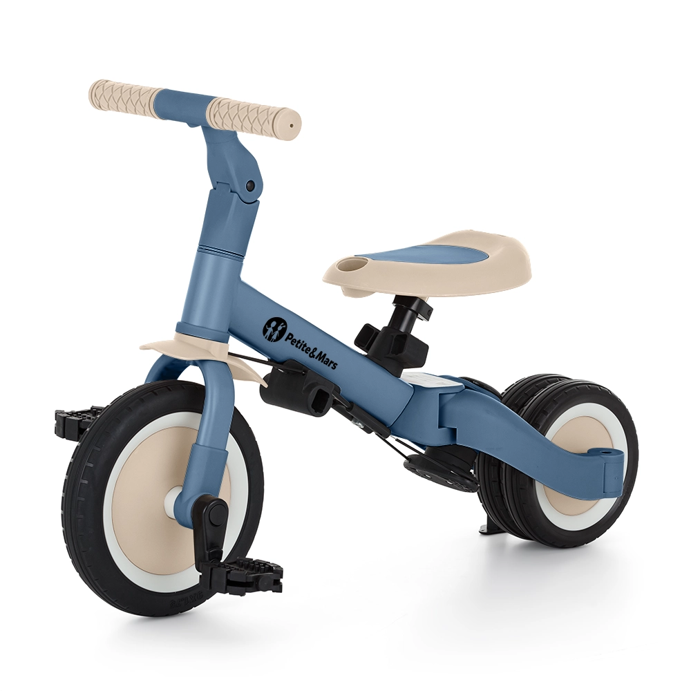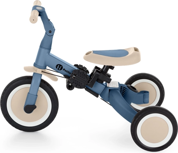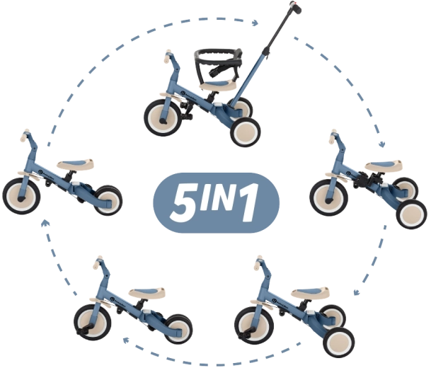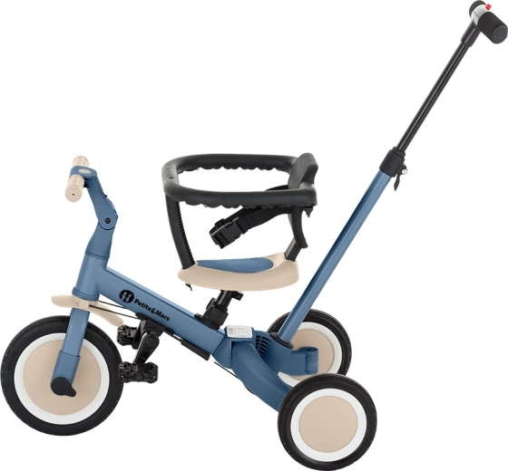 Den multifunktionelle trehjulede PETITE&MARS Turbo Ocean Blue vokser med dit barn fra de første kørselsforsøg til selvstændig kørsel på cykel med pedaler. Takket være et gennemtænkt ombygningssystem tilbyder den hele 5 tilstande efter alder og færdigheder. Fra skubbet trehjulet cykel over løbecykel til klassisk cykel – altid med den stabilitet og komfort, som små ryttere har brug for.