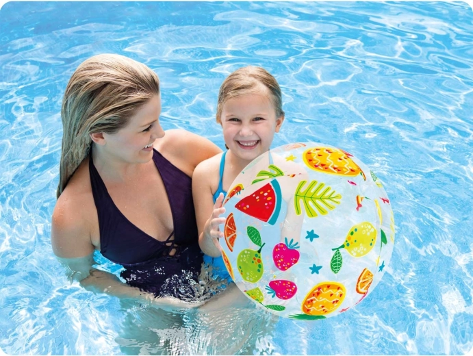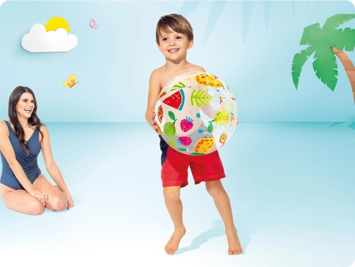 Nyd sommeren fuldt ud med strandbolden Intex med et muntert frugtprint. Let at få øje på i sandet og i vandet, let og kompakt – når den er tømt for luft, fylder den minimalt i tasken. Det holdbare vinylmateriale sikrer lang levetid og bekymringsfri leg.