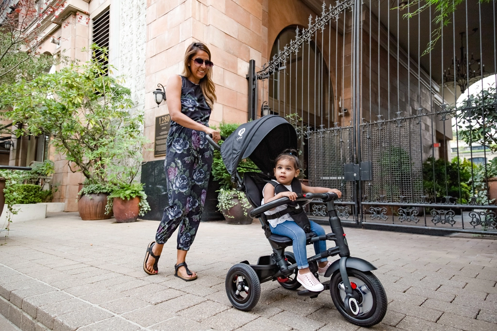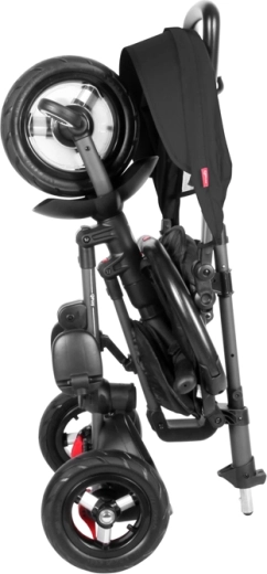 Sikkerhed og komfort sikres af 5-punkts seler, aftagelig bøjle, sammenkoblet bagbremse og friløb på forhjulet. Takket være det justerbare ryglæn, fodstøtterne og muligheden for at slå koblingen til/fra på styret er trehjuleren fantastisk både til hvile og aktiv tråd.