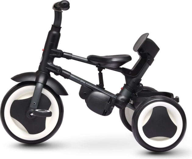 Det praktiske sammenklappelige system uden værktøj muliggør hurtig foldning til et kompakt format og nem transport – efter sammenklapning kan trehjuleren trækkes som en rejsetaske. Vibrationsdæmpende hjul af robust skum udligner ujævnheder, mens friløb og bremser på baghjulet bidrager til sikker kørsel. To kurve giver plads til småting på turen.