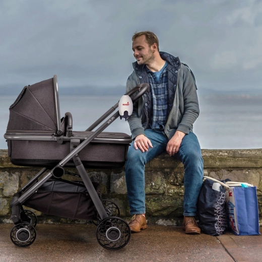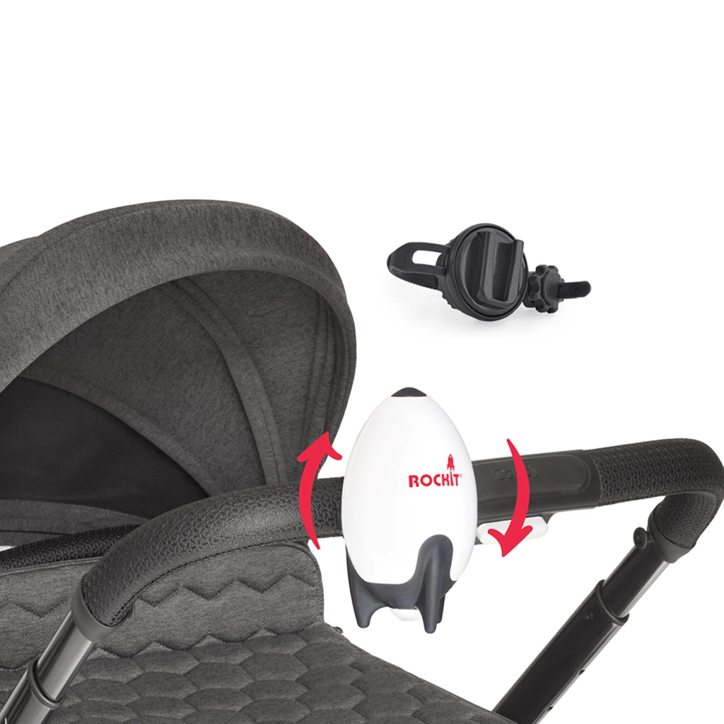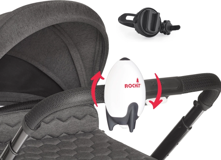 Berolig din baby uden besvær – den bærbare barnevognsvugger ROCKIT vugger barnevognen blidt for dig. Den tilbyder en støjsvag motor med justerbar intensitet, automatisk 60-minutters cyklus, USB-opladning og universelt drejeligt beslag til de fleste barnevogne. Takket være IPX1-vandtæthed er den ideel både hjemme og ude.