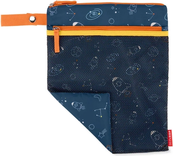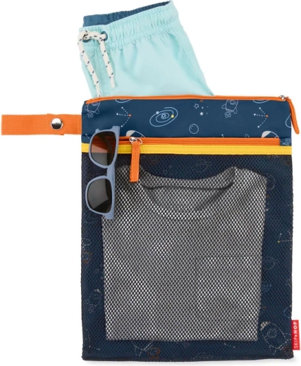 Hold orden og hygiejne også uden for hjemmet. Den vandtætte pose Skip Hop Spark Style med Rocket-motiv har en to-rums løsning, som adskiller våde og snavsede ting fra de rene. Takket være den rumlige lynlåslomme opbevarer du nemt badetøj, håndklæder og børnetøj.
