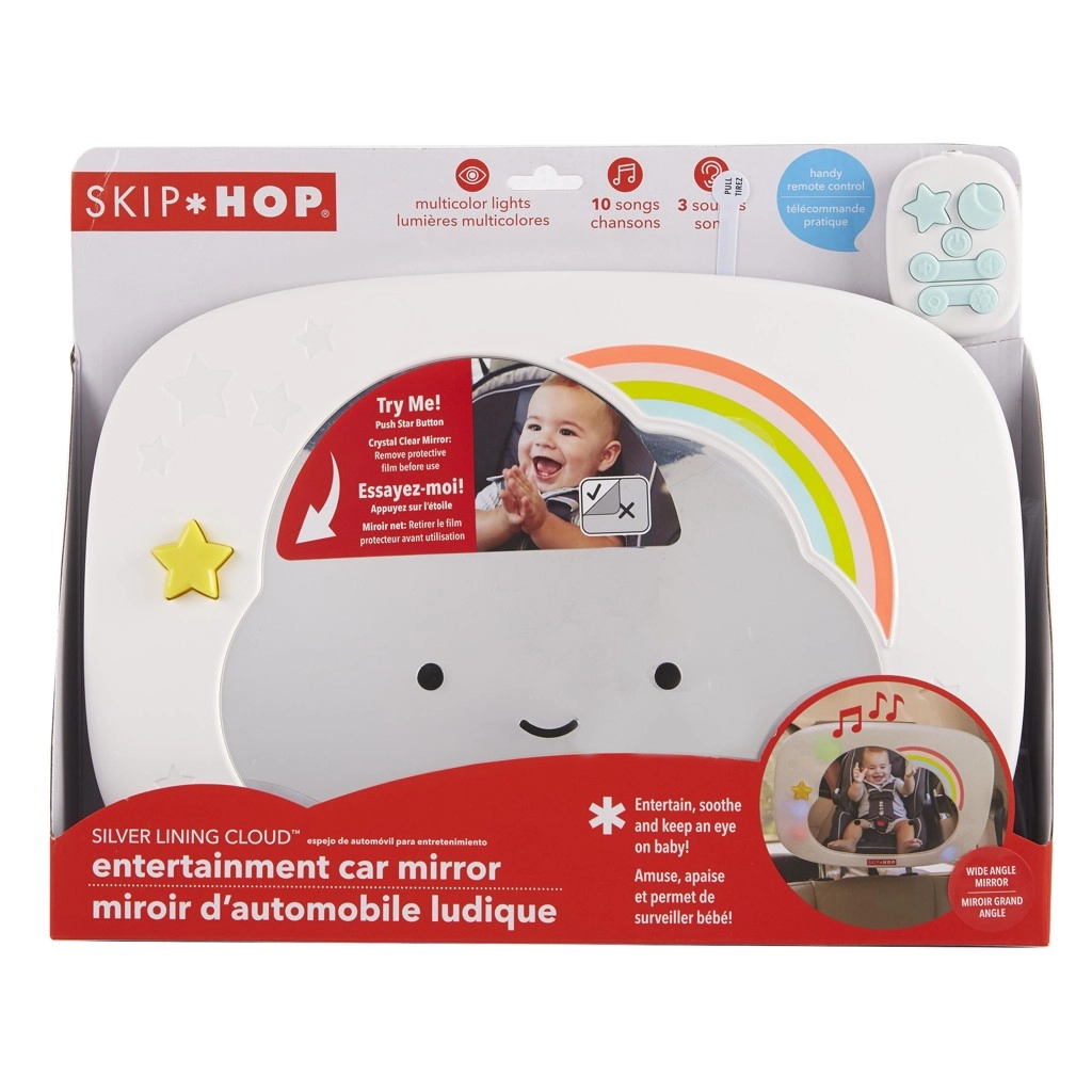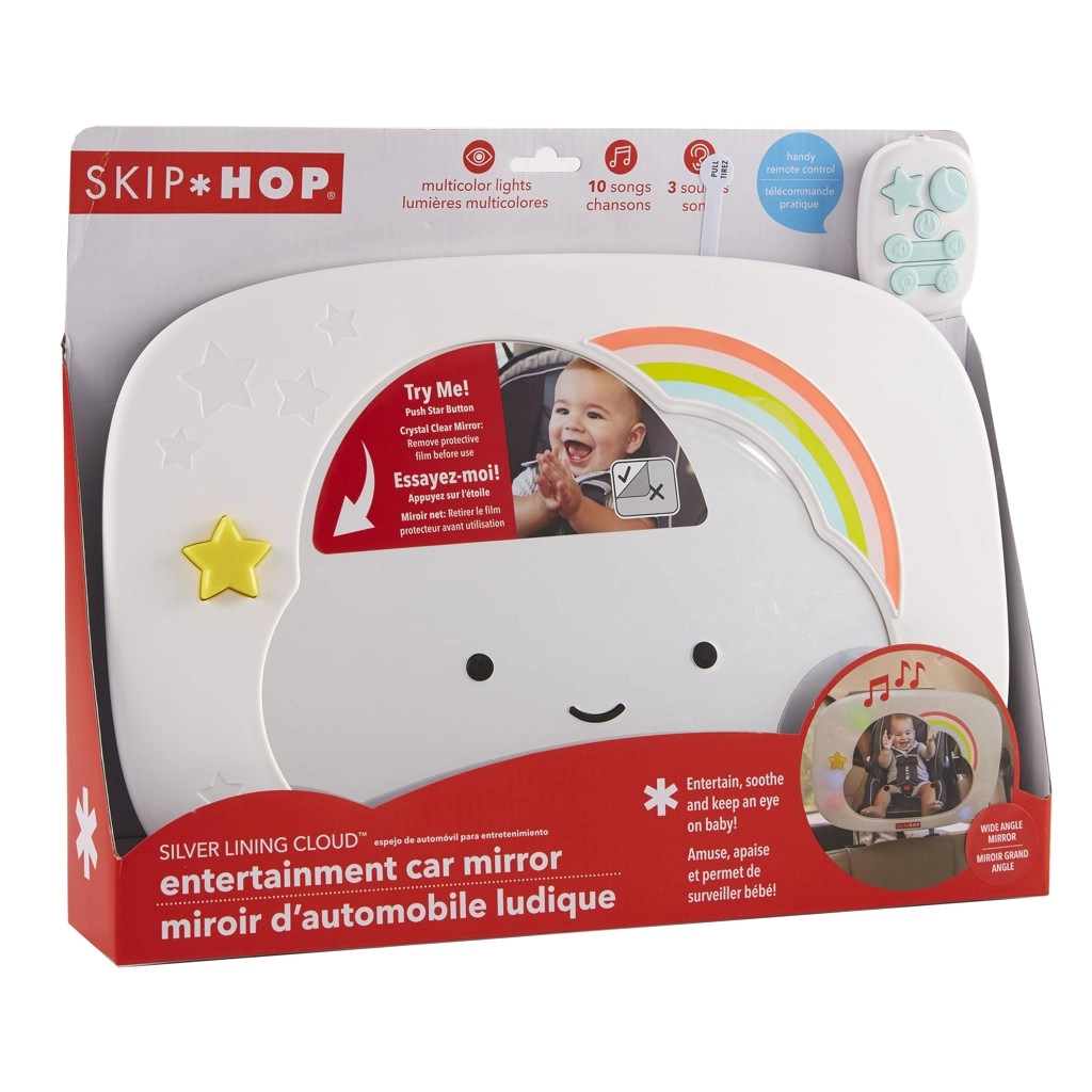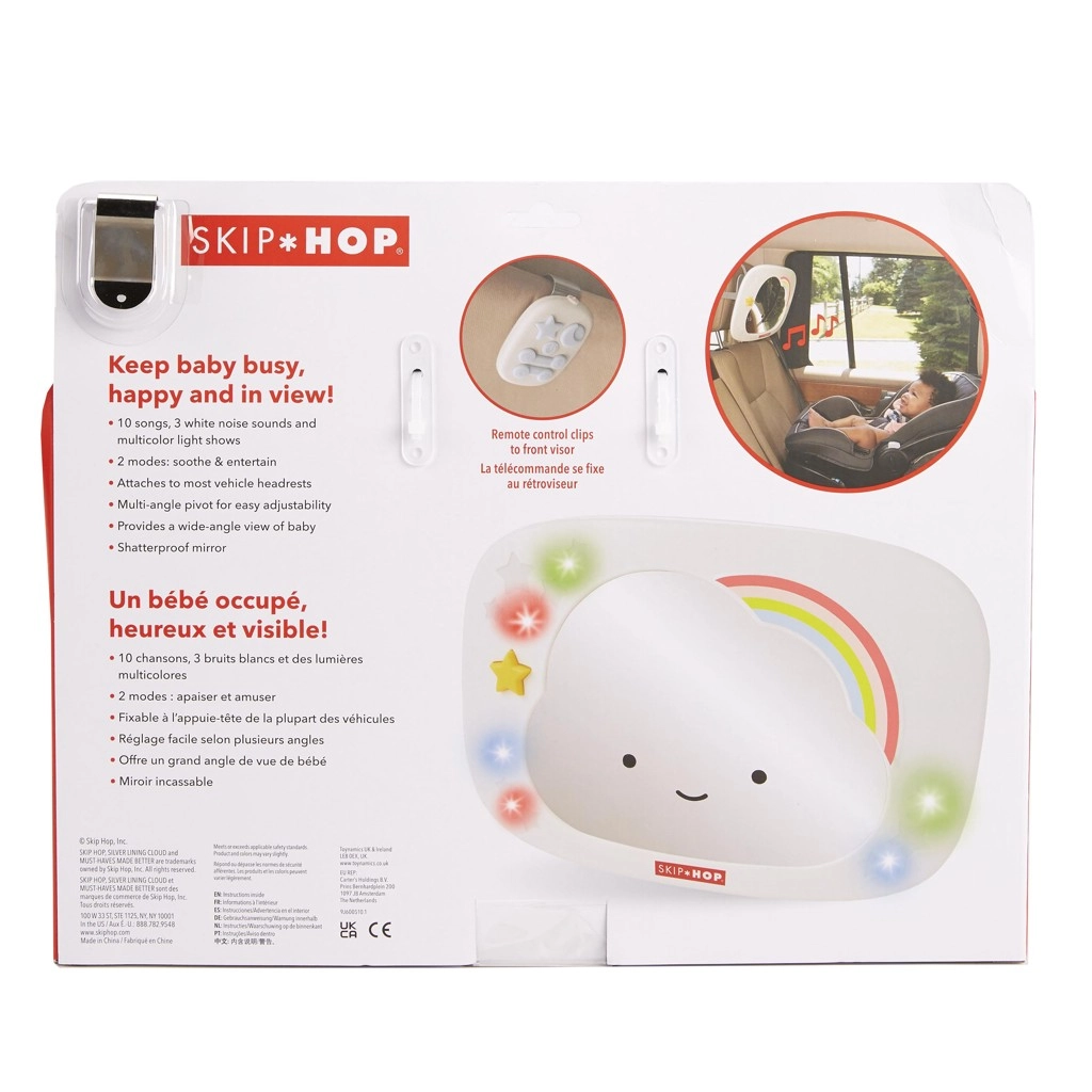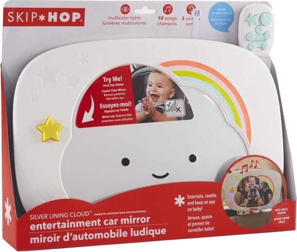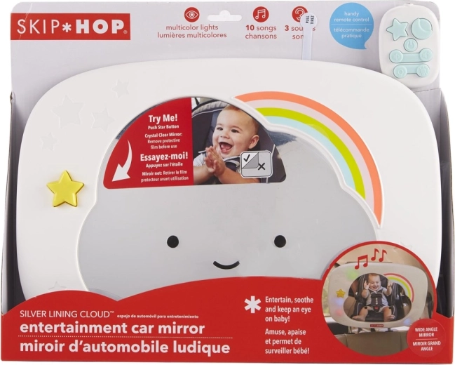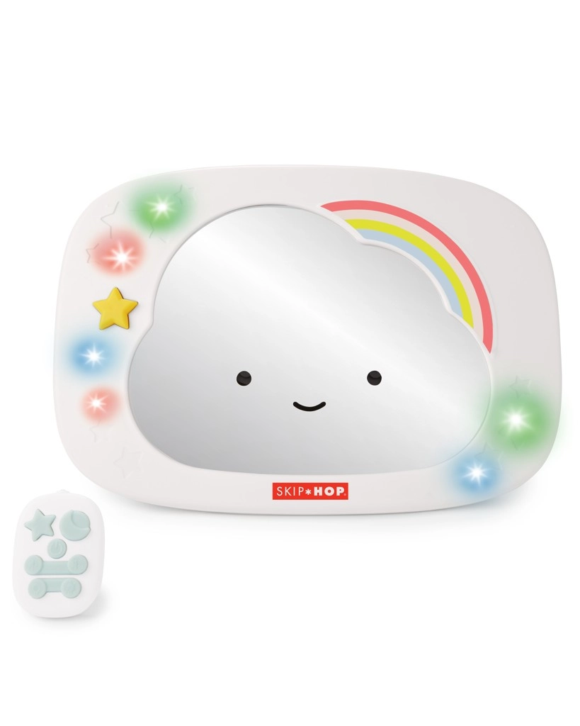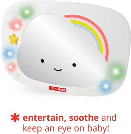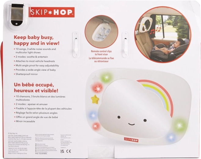 Det søde autostolsspejl formet som en sky fra SKIP HOP hjælper forældre med at holde øje med babyen og samtidig underholde og berolige. Det tilbyder flerfarvede LED-lys, musik og hvid støj, fjernbetjening med klips og bred synsvinkel takket være den store, buede spejloverflade og det multivinklede led.