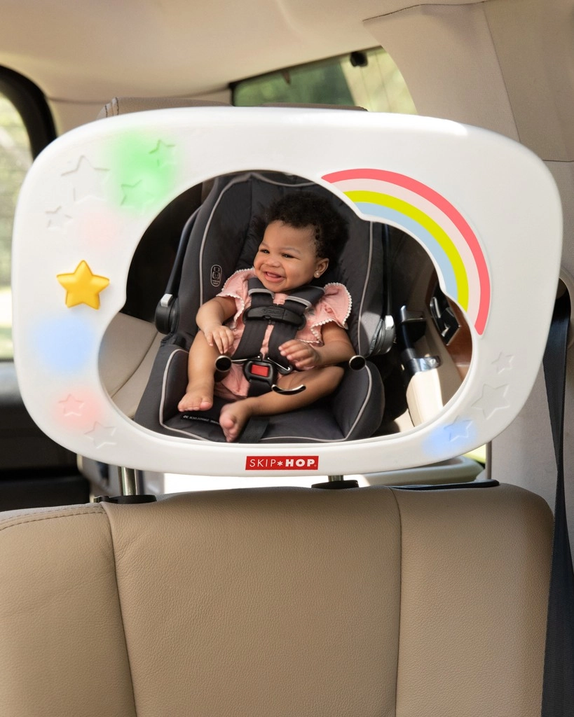 Nyd en mere afslappet køretur med det smarte bakspejl SKIP HOP Silver Lining Cloud. Den store, let buede overflade giver en bred synsvinkel til barnet i den bagudvendte autostol, mens lyseffekter, 10 melodier og 3 lyde med hvid støj sikrer mild visuel og auditiv stimulering. Alt styres bekvemt med fjernbetjeningen med klips, som kan sættes på solskærmen.