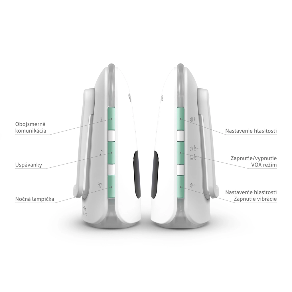 - VOX-tilstand, registrering af signaltab, tovejs kommunikation, temperatursensor (alarm ved høj/lav temperatur), lav batteriadvarsel, indstilling af alarmfølsomhed, vibrationer, lydløs tilstand, lydstyrkekontrol, natlampe, lydlocator til forældreenheden, vuggeviser