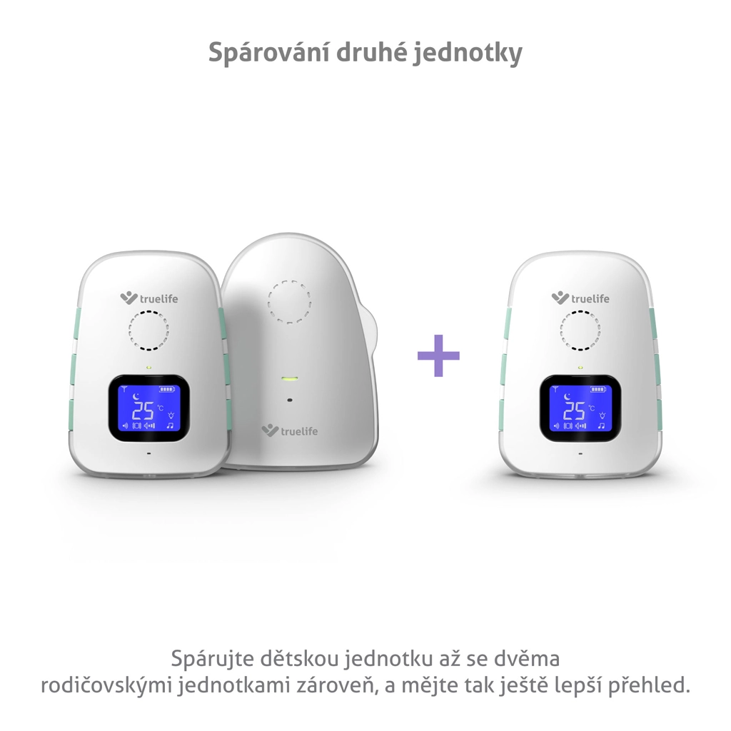 TrueLife NannyTone VM3 er en pålidelig digital babyalarm, der giver uforstyrret overblik over, hvad der sker på børneværelset. Den stabile og sikre lydoverførsel har en rækkevidde på op til 800 m i åbent område og op til 300 m i bygninger og suppleres af en følsom VOX-tilstand, som kun aktiverer alarmen ved registreret lyd for at spare batteri. Takket være tovejs kommunikation kan du berolige babyen på afstand og vælge mellem 8 vuggeviser med justerbar lydstyrke.