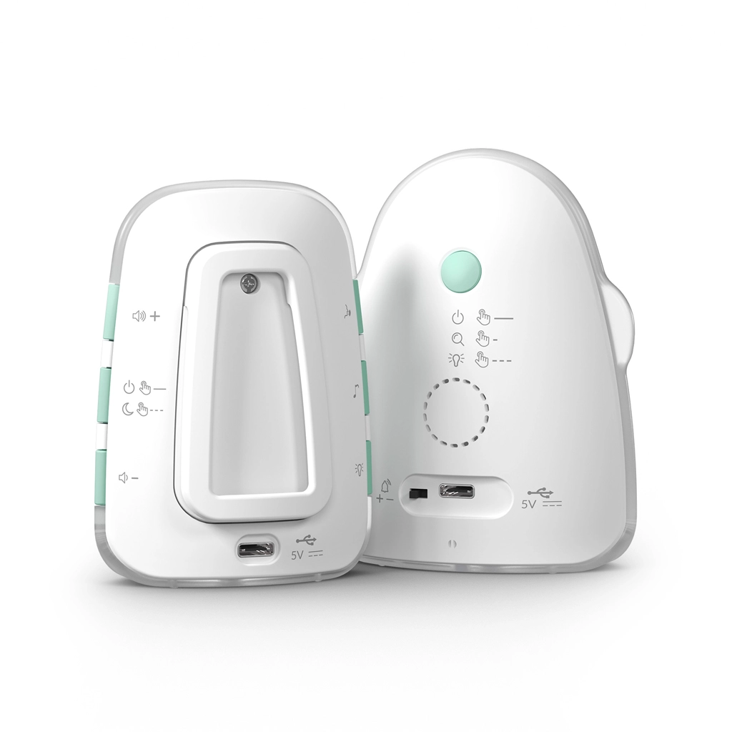 Forældreenheden med LCD-display viser temperatur, batteristatus og signalstyrke. Der er temperaturovervågning med advarsel ved lav eller høj temperatur, lydløs tilstand med vibrationer, en praktisk natlampe samt en lydlocator til forældreenheden. Begge enheder har indbyggede batterier med lang driftstid og bekvem opladning via USB‑C, eventuelt fra en powerbank.