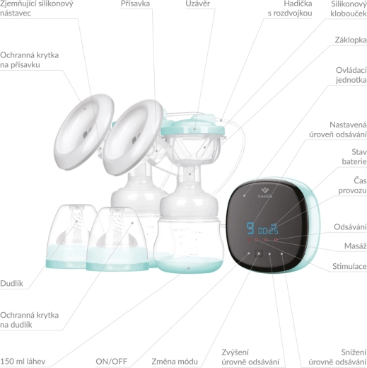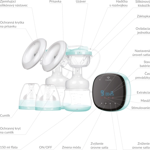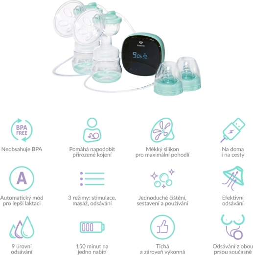 Betjeningen er enkel takket være LED-skærm med touchknapper og en praktisk timer. Vælg mellem 3 tilstande – stimulation, massage og pumpning – samt 9 intensitetsniveauer for maksimal komfort. Den lette konstruktion, de kompakte mål og et batteri med op til 150 minutters driftstid gør denne pumpe ideel både hjemme og på farten. Bløde silikoneindsatser med fleksibel kant og BPA-fri materialer sikrer sikkerhed for dig og din baby.
