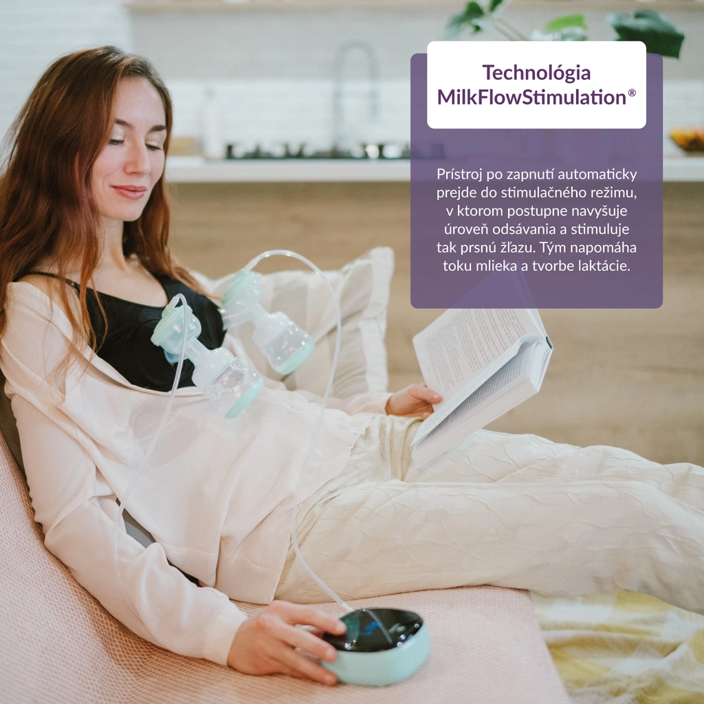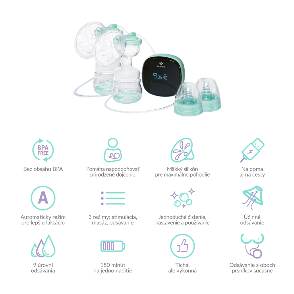 TrueLife Nutrio BP er en pålidelig elektrisk dobbeltpumpe designet til mødre, der vil spare tid og maksimere komforten. Samtidig pumpning fra begge bryster understøtter laktationen, sparer tid og gør det muligt at have mælk klar til senere – den kan holde sig i køleskabet i op til 48 timer. Teknologien MilkFlowStimulation® hjælper med skånsom stimulering af mælkeflowet og er velegnet selv ved ammeudfordringer.