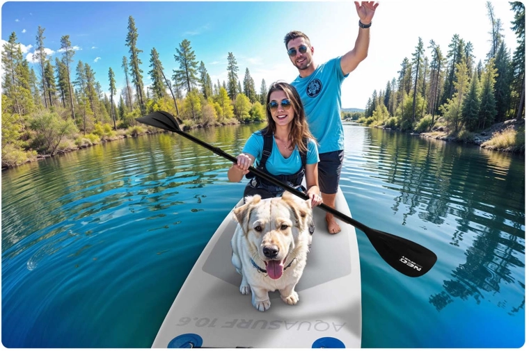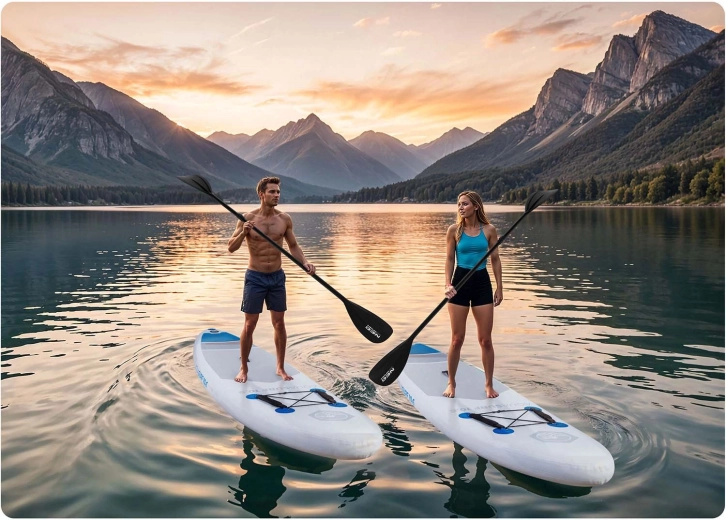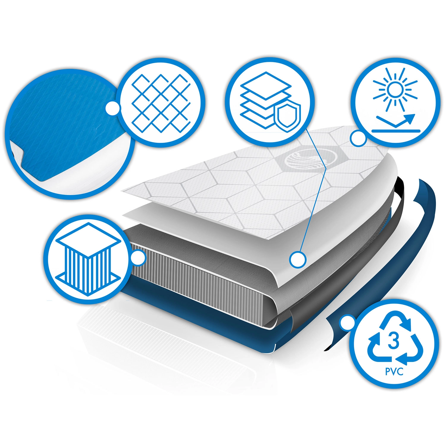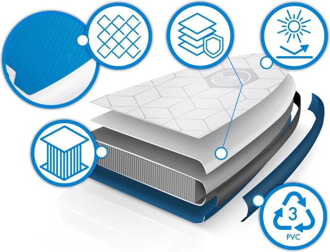 Flerlags PVC, tæt Drop Stitch-fiber og forstærkede sømme giver høj stivhed, UV-modstand og lang levetid. Skridsikker EVA-top for et sikkert fodfæste.