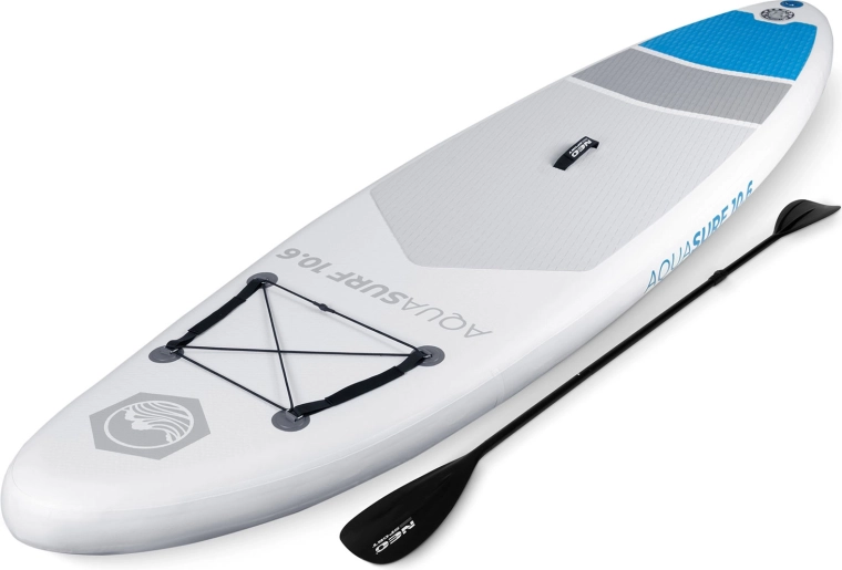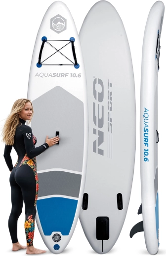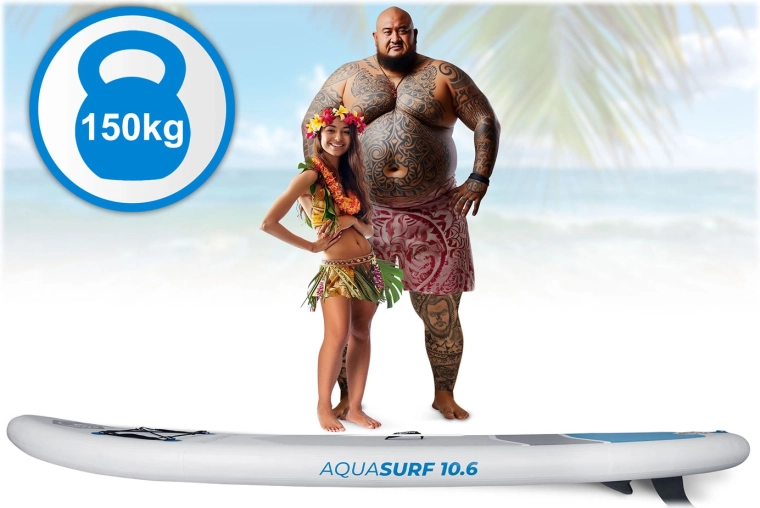 AQUASURF 10'6 er et alsidigt oppusteligt SUP til rekreativ roning, fitness og ture på søer og rolige floder. Takket være bredden på 84 cm tilbyder den fremragende stabilitet, volumen på 318 l bærer roere op til 150 kg, og den skridsikre EVA-top giver sikkerhed i hvert skridt. Tre komfortable håndtag gør håndtering let både på land og i vandet.
