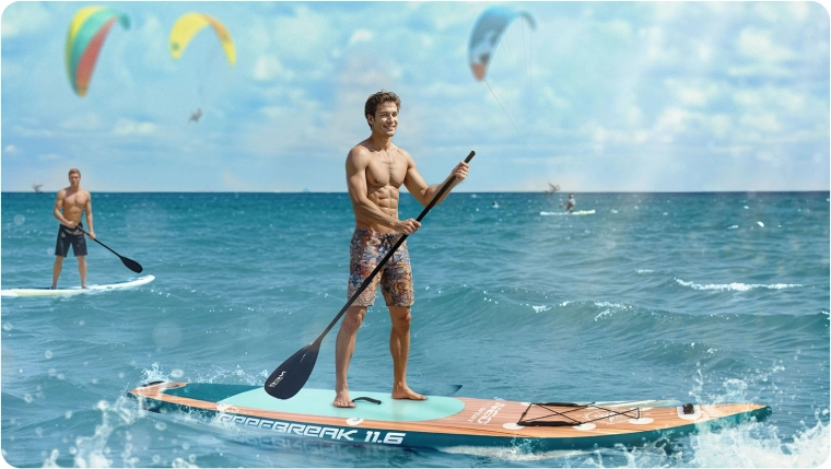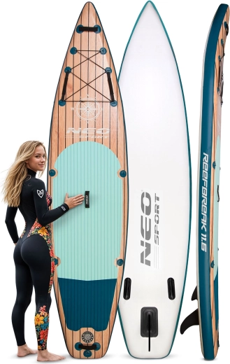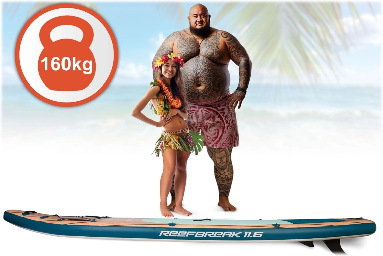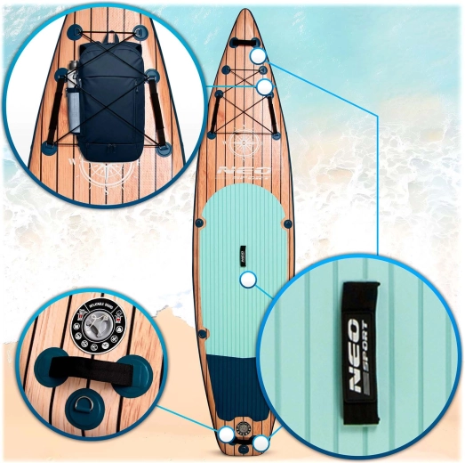 Oplev et stabilt og holdbart oppusteligt paddleboard Reefbreak fra Neo‑Sport med målene 350 × 81 × 15 cm. Takket være Drop Stitch Light-teknologi og tredobbeltlags PVC‑konstruktion tilbyder det fremragende stivhed, lav vægt og bæreevne op til 160 kg. I pakken finder du et komplet sæt tilbehør – justerbar aluminiumsåre, håndpumpe, sæde med ryglæn og opbevaringslomme, sikkerhedsleash, aftagelig finne, rygsæk og reparationssæt. Den skridsikre EVA‑måtte, 5 praktiske håndtag og det forreste bungee‑system sikrer komfort og sikkerhed på roligt vand og mindre bølger.