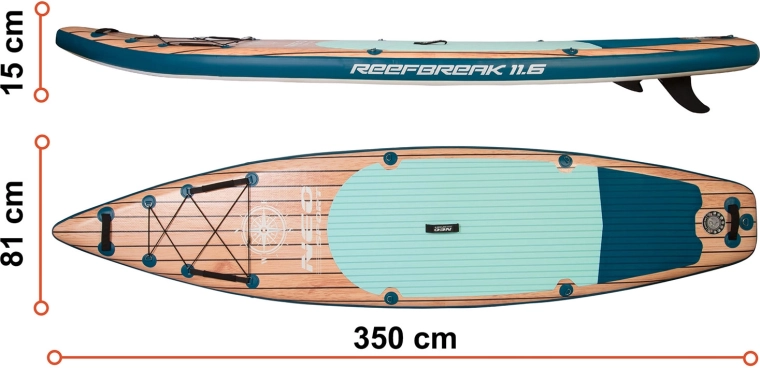 Reefbreak 350 er et alsidigt SUP til rekreativ roning, udflugter og træning på vandet. Tredobbeltlags PVC med dobbeltvævet Drop Stitch, forstærkede sømme og integreret kulfiberforstærkning langs rails giver enestående stivhed uden unødig vægt. Med en bredde på 81 cm er boardet stabilt for både begyndere og øvede, samtidig med at det bevarer smidighed og god retningsstabilitet.