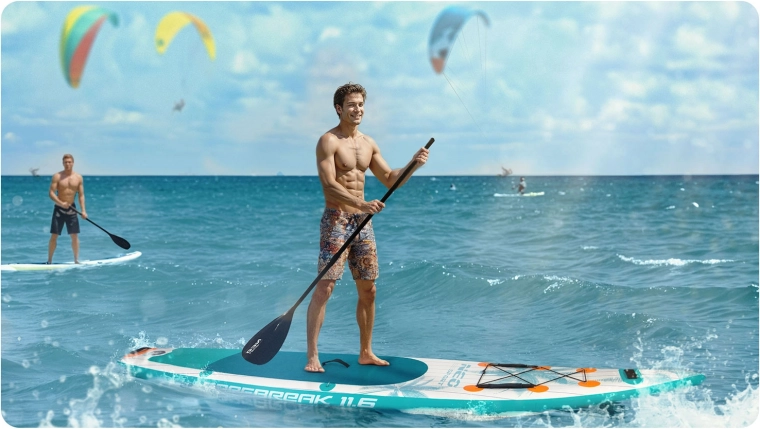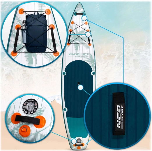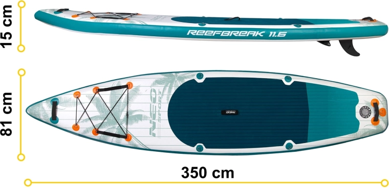 Neo-Sport Reefbreak er et oppusteligt SUP-board designet til rekreativ padling, heldagsudflugter og de første forsøg på vandet. Takket være målene 350 × 81 × 15 cm giver det fremragende stabilitet og sikkerhed for begyndere og samtidig nok fart og retningsstabilitet til mere erfarne roere. Den lette men stive Drop Stitch Light-konstruktion garanterer høj modstandsdygtighed og nem håndtering ved transport og opbevaring.