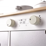 To kogeplader med drejeknapper, ovn med vindue og tryk med timer samt praktisk mikrobølgeovn. Børn kan sikkert prøve, hvordan rigtige apparater fungerer.
