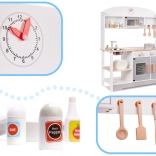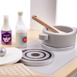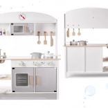Stilfuldt trælegetøjskøkken i MDF i neutrale farver, der giver timevis af kreativ leg. Det har en aftagelig vask i metal, kogeplader med drejeknapper, ovn med vindue og display, mikrobølgeovn samt opvaskestativ. Inkluderer rigt trætilbehør (gryde, pande, tallerkener, kniv, ske, palet og krydderikrukker) samt praktiske kroge og hylder til opbevaring. Sikkert, glat slebet og malet med giftfri farver.