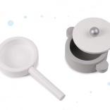 Gryde og pande med låg, tallerkener, skærebræt og redskaber samt krydderikrukker – alt i matchende design og klar til at servere fantasifulde lækkerier.
