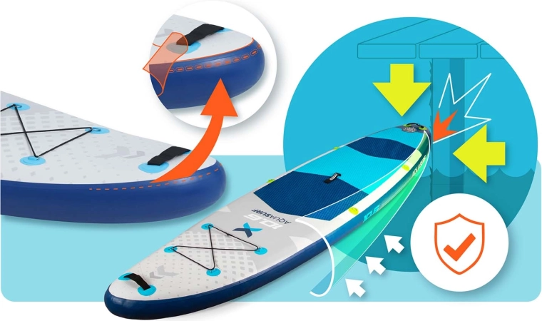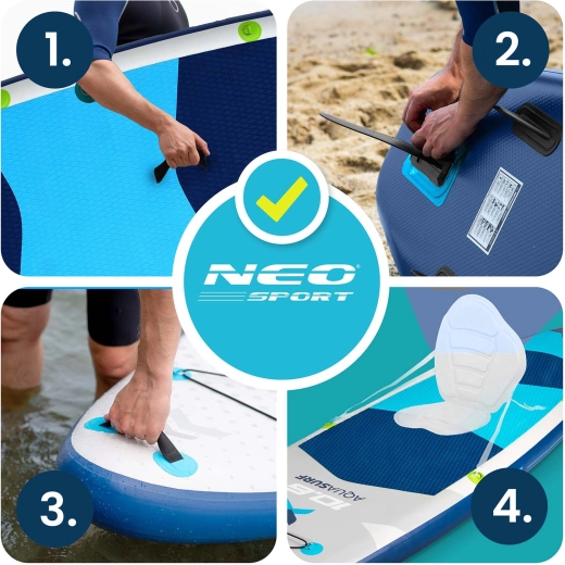 Nyd sommeren fuldt ud med den oppustelige paddleboard AQUASURF 10’6 – et stabilt, holdbart og let board til roligt vand og mindre bølger. Sættet indeholder alt til at komme på vandet med det samme: justerbar aluminiums-paddel, to-virkende pumpe med manometer, sikkerhedsleash, aftagelig finne, reparationssæt og transportrygsæk. Den skridsikre EVA-dækplade, forreste bungee-system til udstyr og konstruktion i 3-lags PVC Drop Stitch Light giver sikkert fodfæste, nem manøvrering og lang levetid.